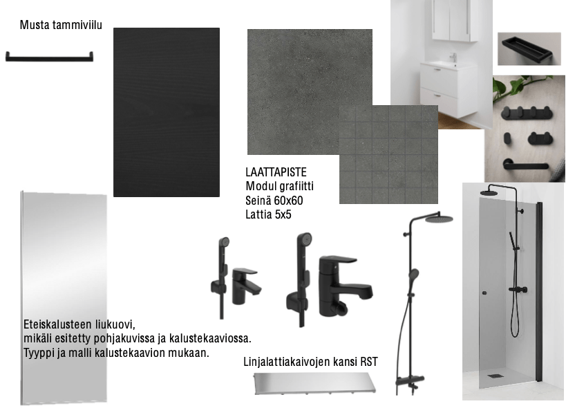 | Kylpyhuone | Varusteet: suihkuseinä Seinät: kaakeli Lattia: laatta |