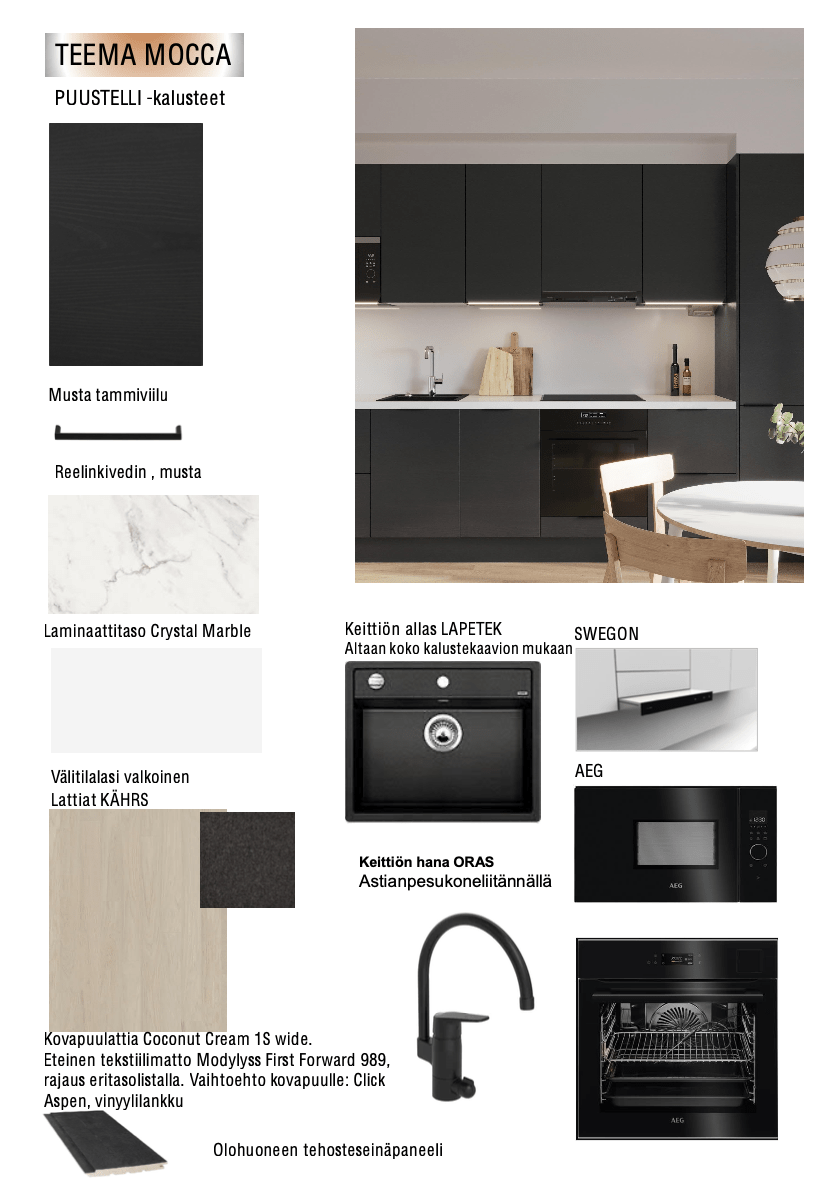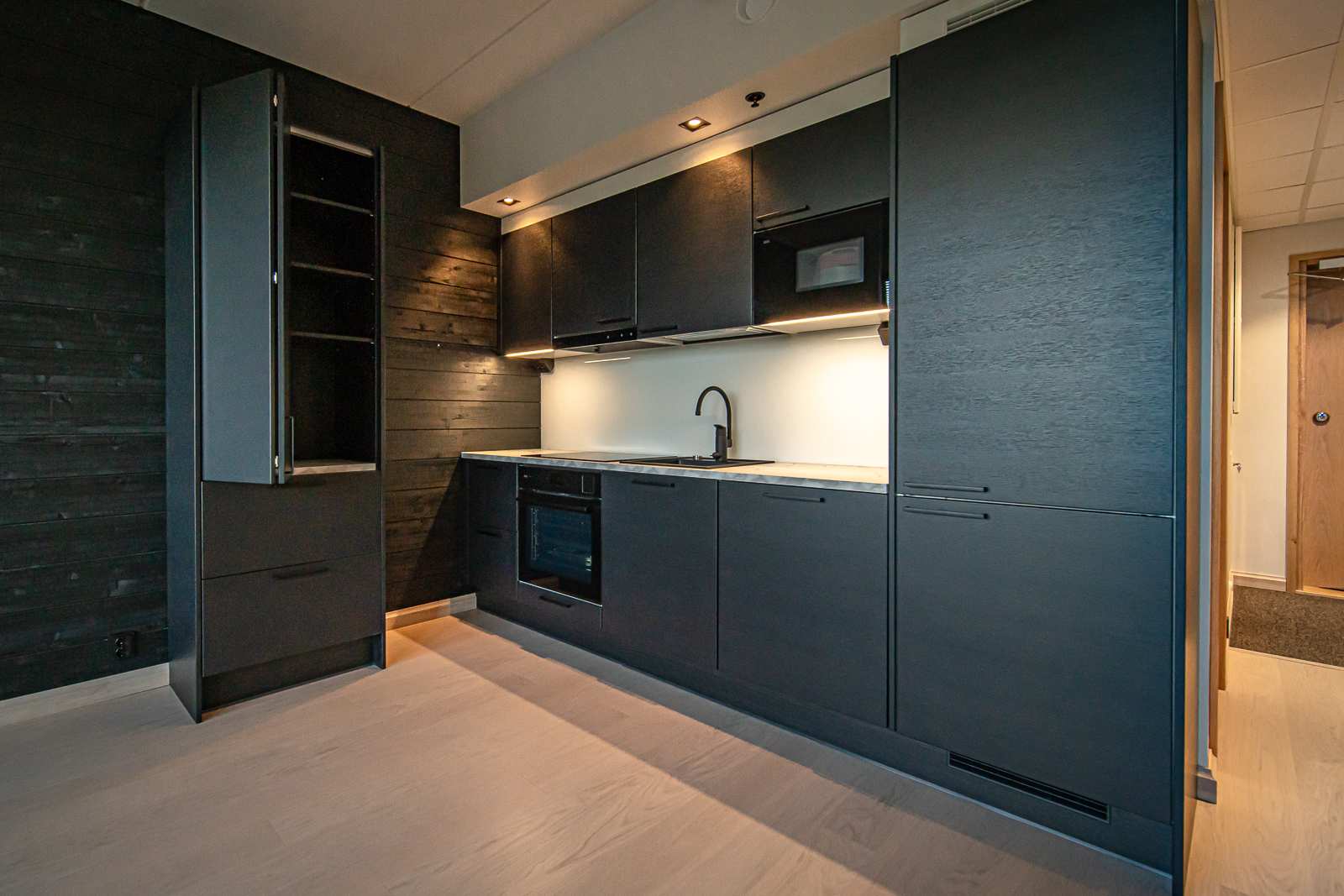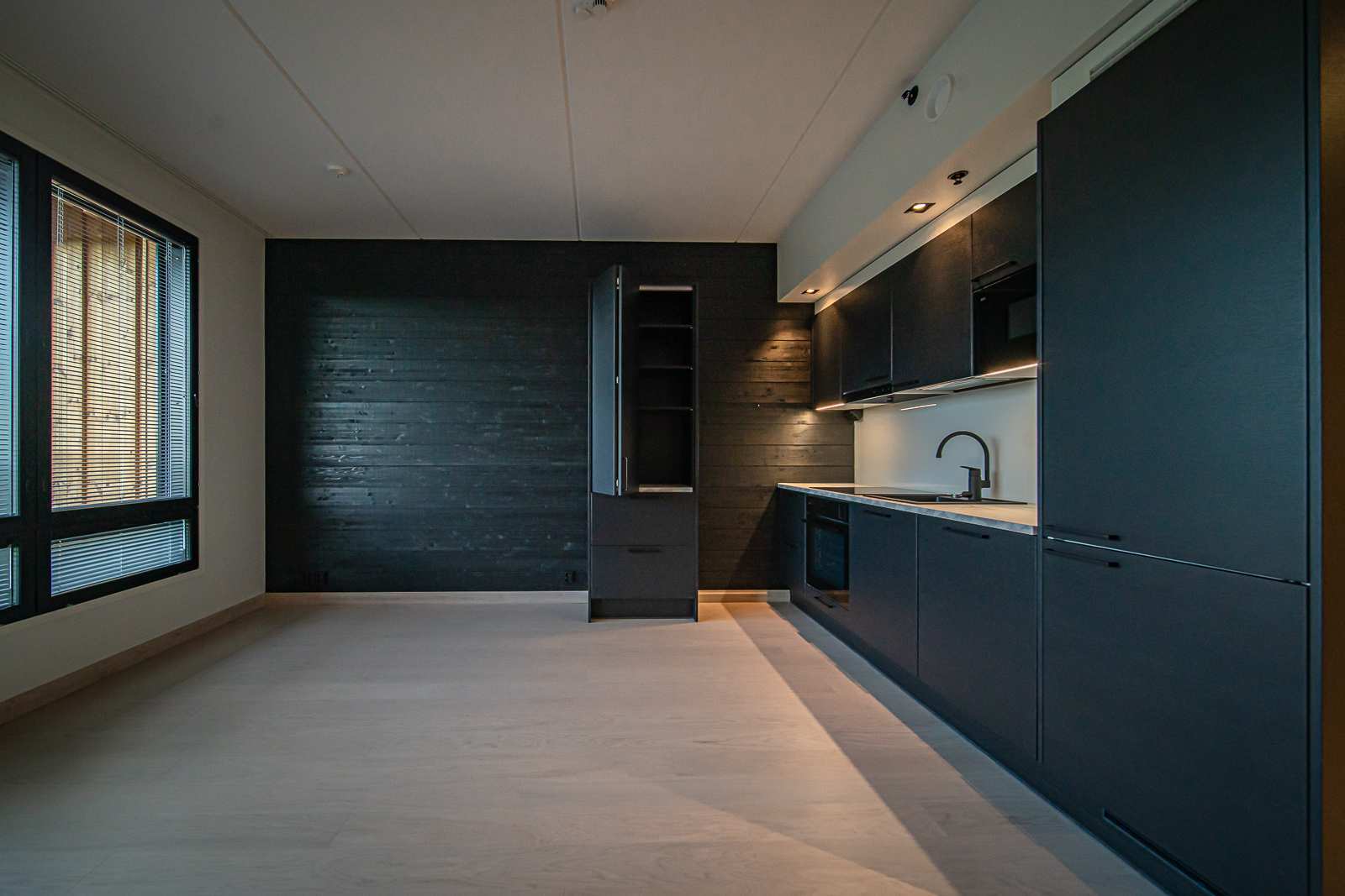 | Keittiön varustus | Jääkaappi ja pakastin: jääkaappi/pakastin Muut varusteet: mikroaaltouuni, astianpesukone, kiinteät valaisimet, liesituuletin / hormi Tasot: laminaatti Seinät: maalattu Lattia: muu, vinyyli Liesi/uuni: integroitu, induktio, erillisuuni |