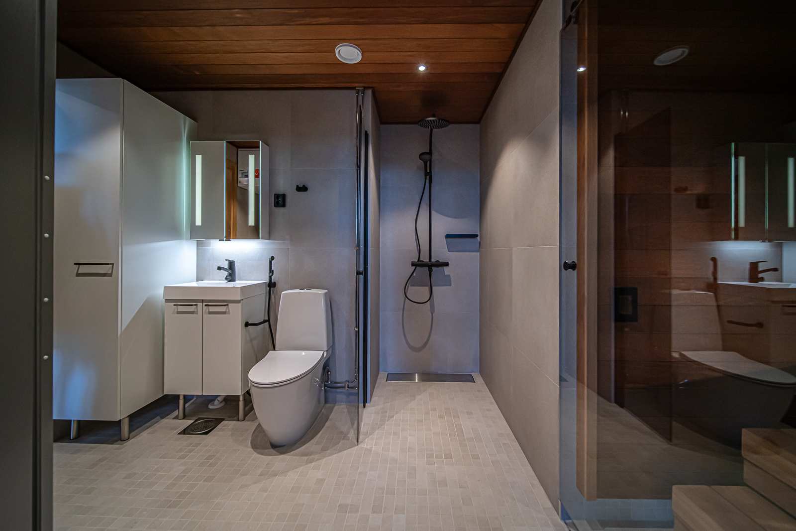 | Saunan pinnat | Seinät: puu Lattia: laatta |