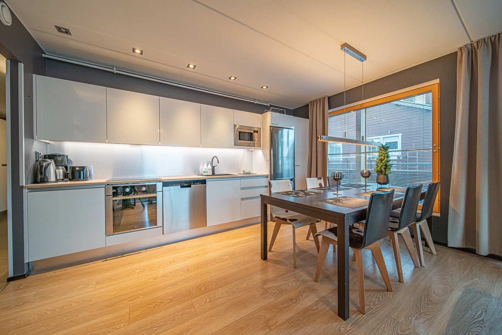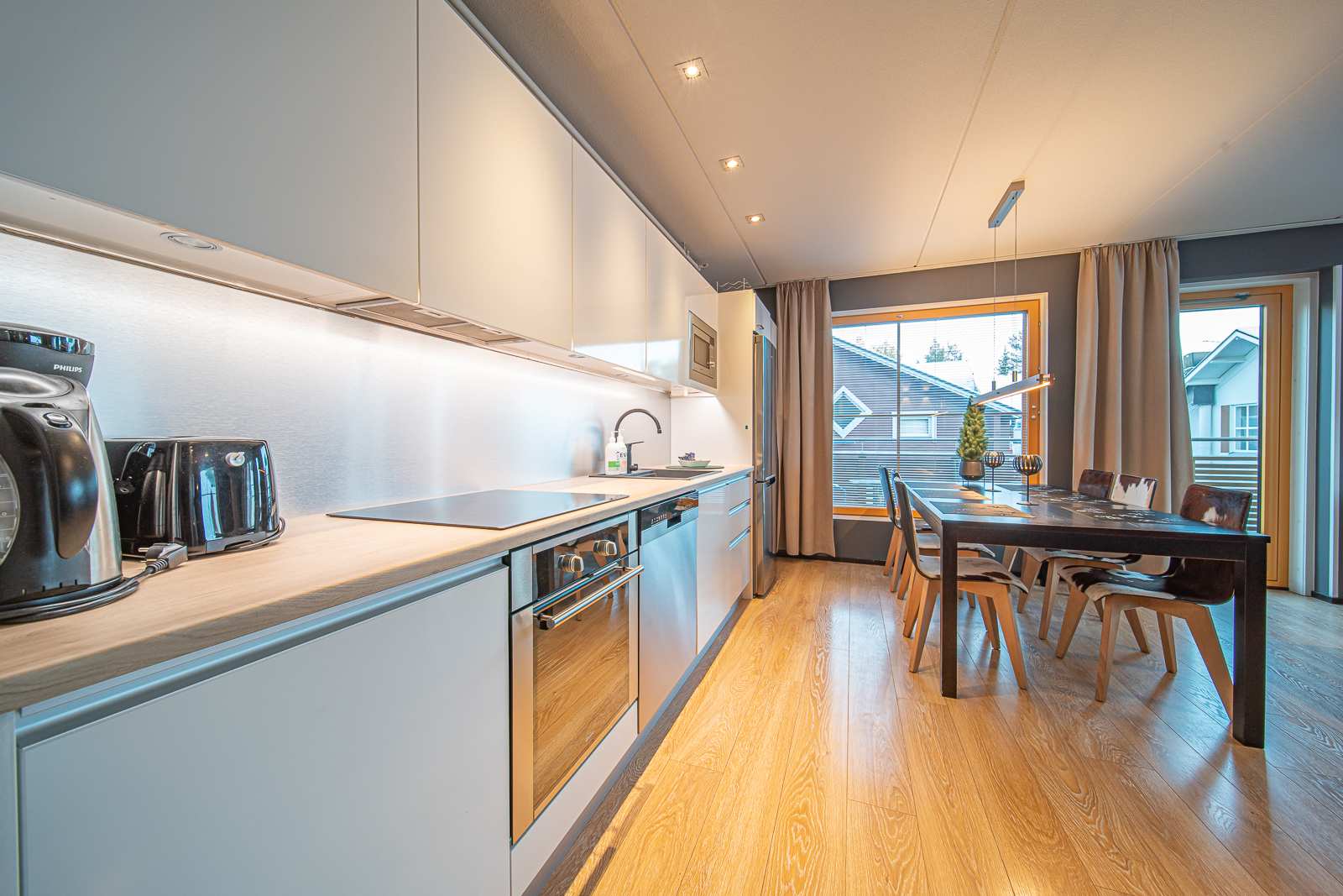 | Keittiön varustus | Jääkaappi ja pakastin: jääkaappi/pakastin Muut varusteet: mikroaaltouuni, astianpesukone Tasot: laminaatti Seinät: maalattu Liesi/uuni: muu, induktio, erillisuuni |