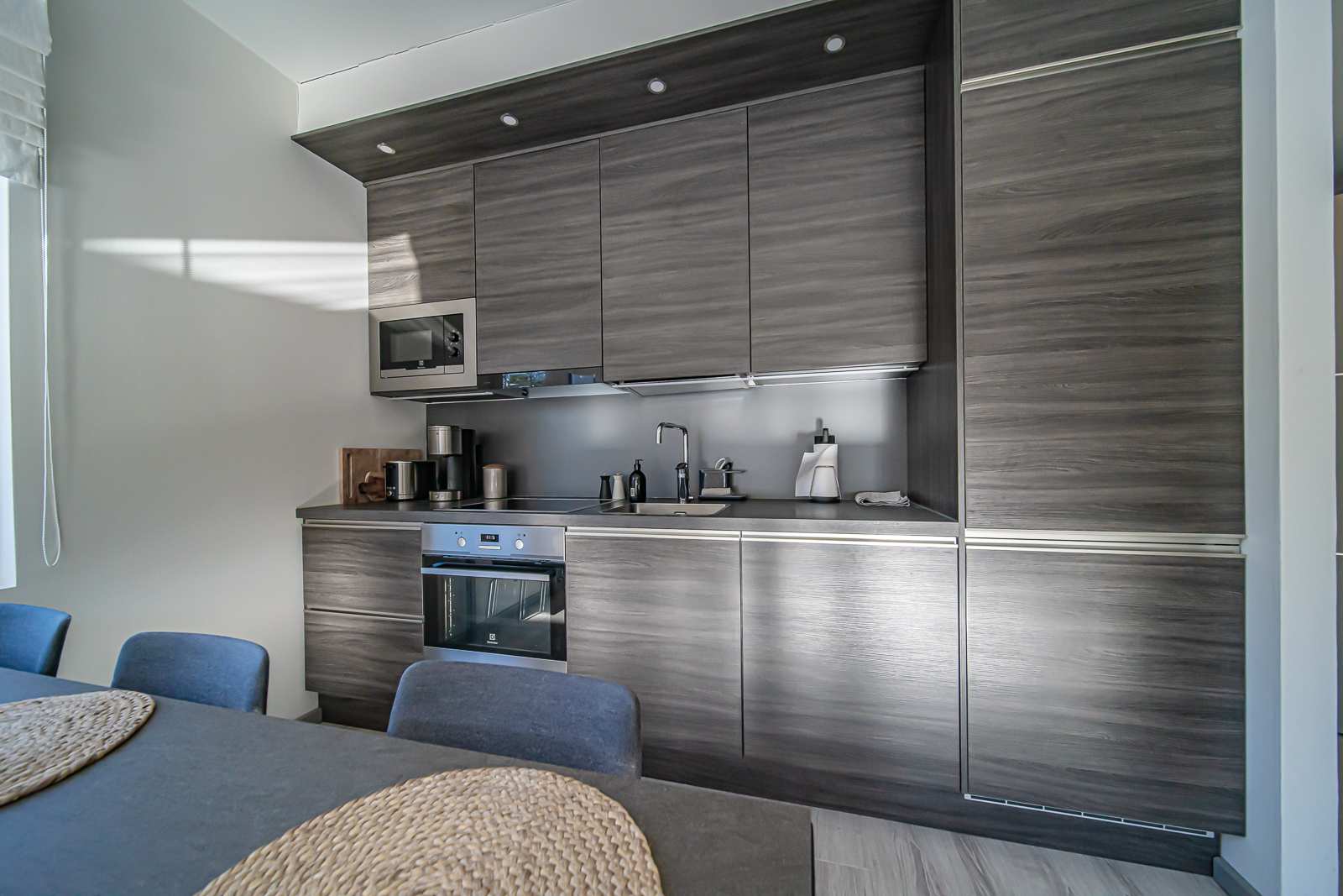 | Keittiön varustus | Jääkaappi ja pakastin: jääkaappi/pakastin Tasot: laminaatti Seinät: kaakeli, maalattu Lattia: laminaatti Muut varusteet: liesituuletin, astianpesukone Liesi/uuni: induktio, erillisuuni |