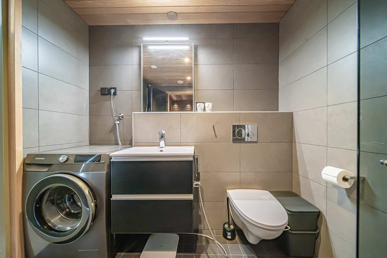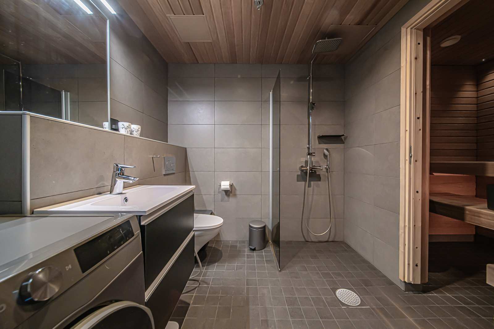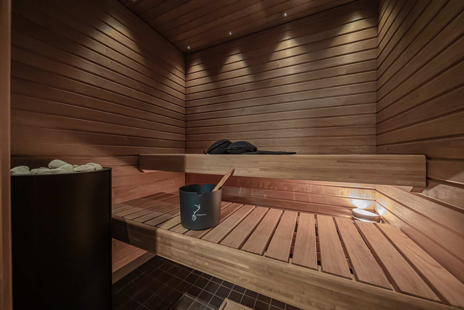 | Saunan pinnat | Seinät: puu Lattia: laatta |