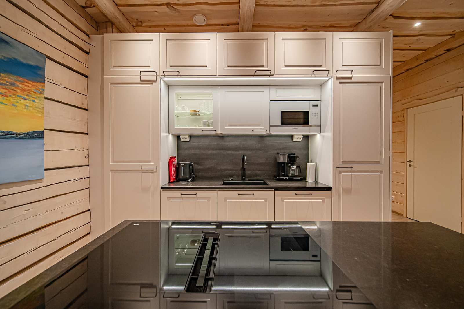| Keittiön varustus | Jääkaappi ja pakastin: jääkaappi, pakastin Tasot: kivi Seinät: puu Lattia: vinyylikorkki Muut varusteet: liesituuletin, mikroaaltouuni, astianpesukone Liesi/uuni: induktio, erillisuuni |