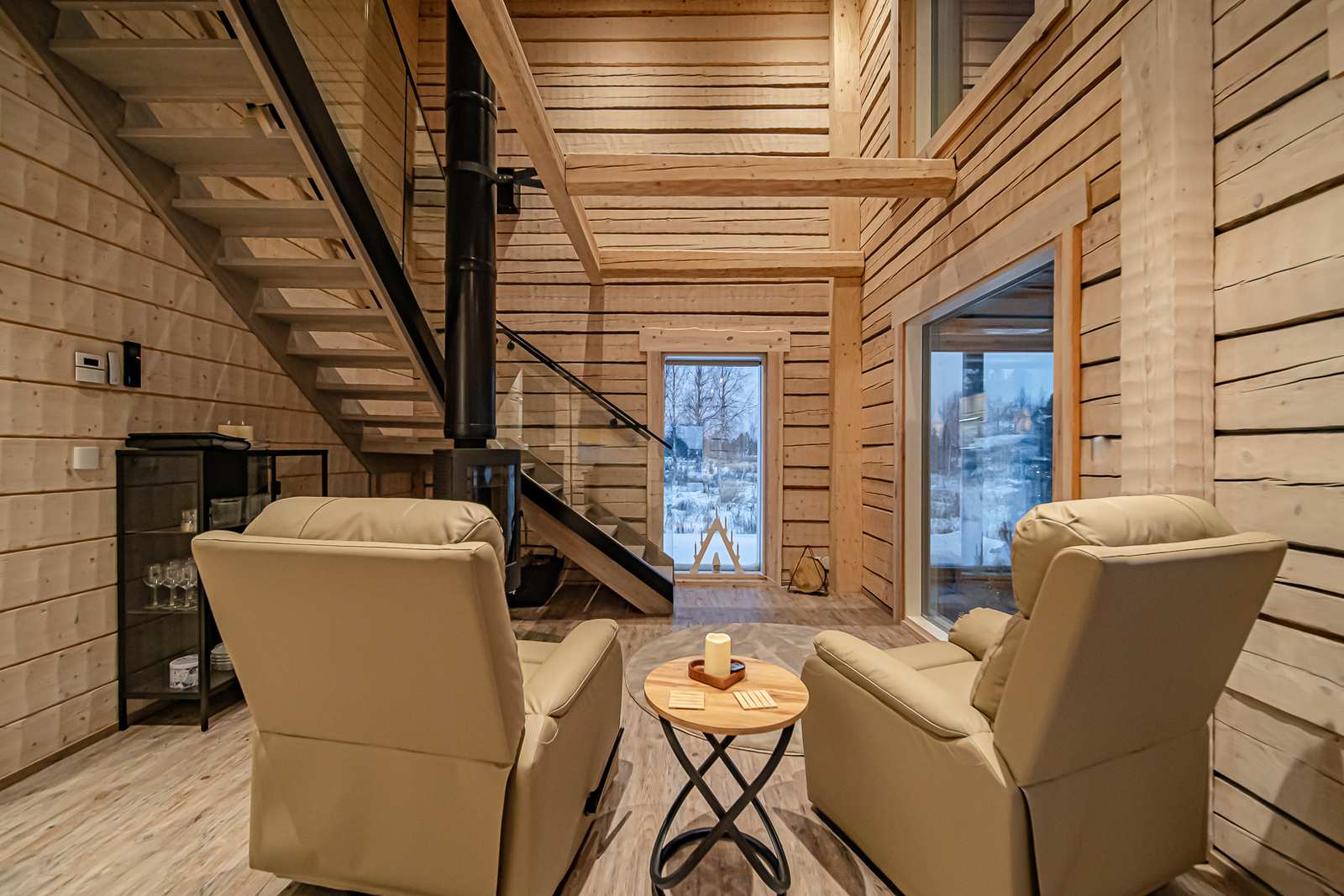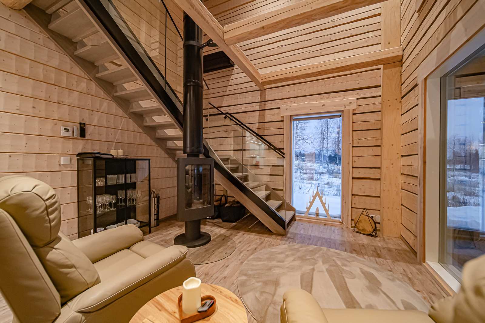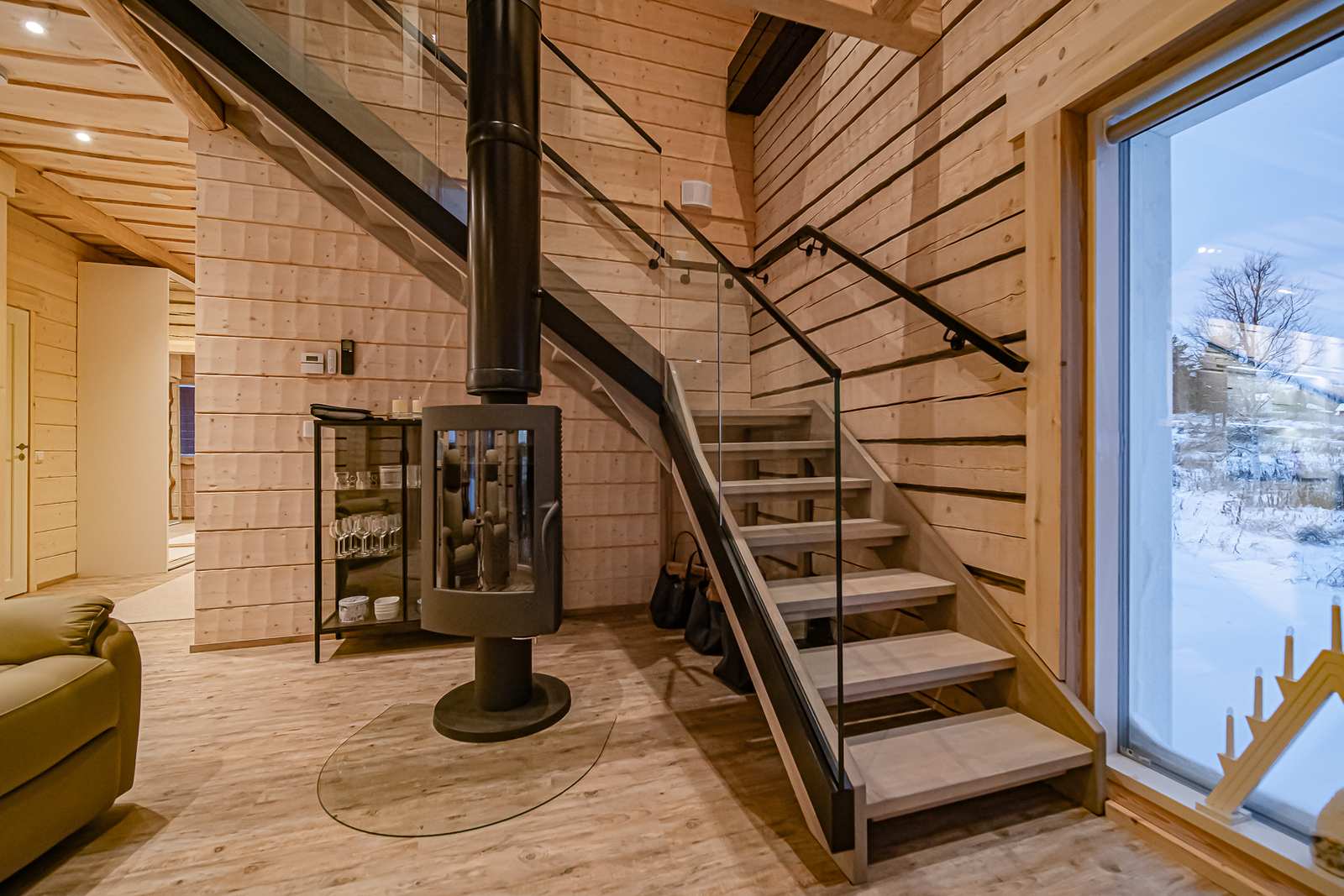 Alakerrassa tupakeittiö, yksi makuuhuone, kylpyhuone-sauna-wc sekä koko huvilan sydän, talon levyinen lasihuone, jonka isot ikkunat tuovat luonnon sisälle. Yläkerrassa aula, kaksi makuuhuonetta, kylpyhuone sekä iso lasitettu parveke.