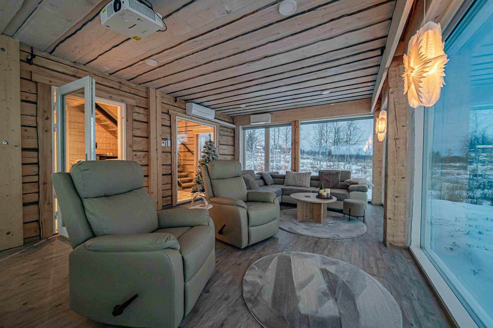 Huvilassa kaksi ilmalämpöpumppua. Lasihuoneessa ilmalämpöpumppu tuo mukavuuslämpöä sekä viilennystä kesäpäiviin. Toinen ilmalämpöpumppu löytyy yläkerran oleskelutilaan johtavasta portaikosta, jolloin vaikutus ulottuu sekä ala- että yläkertaan.