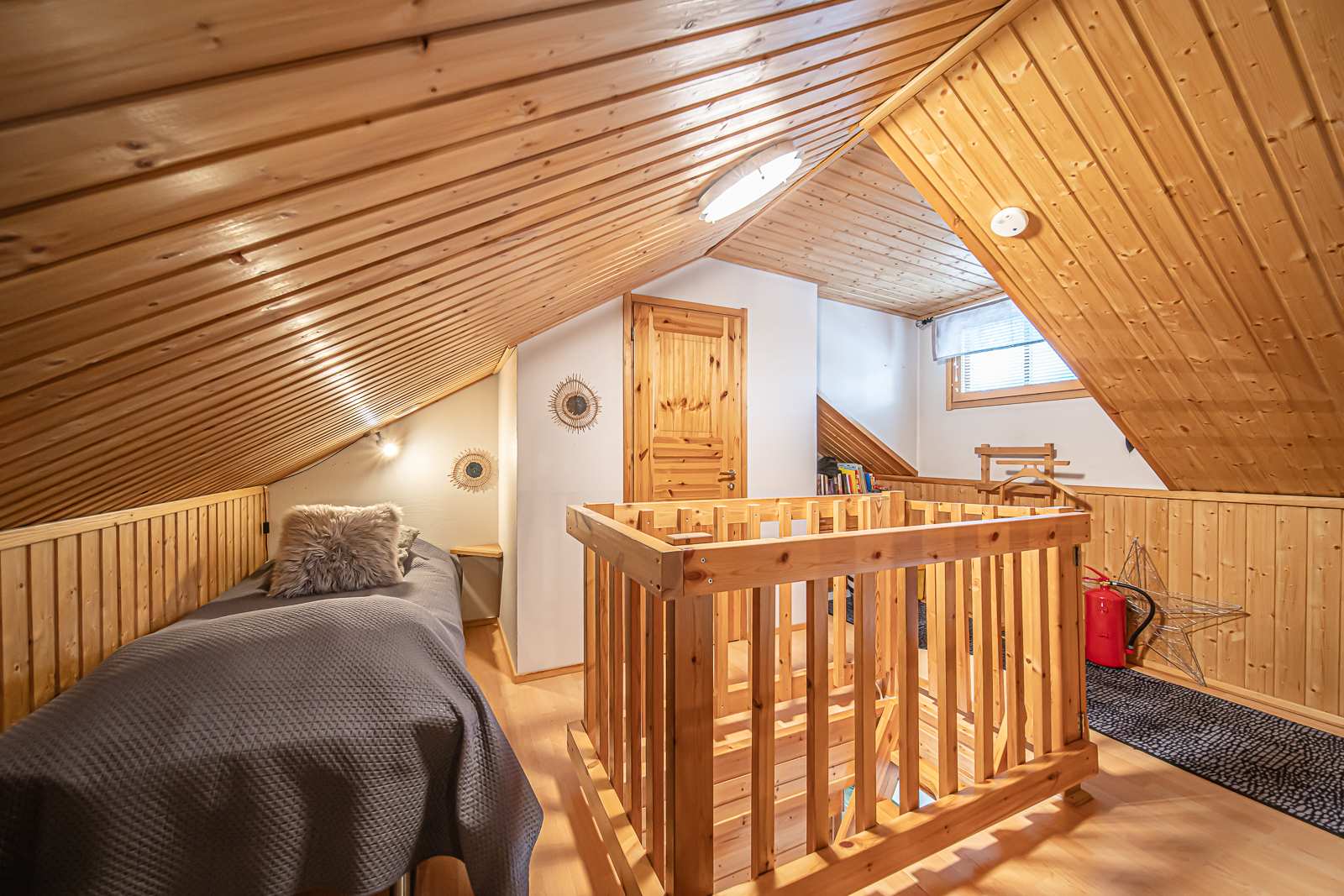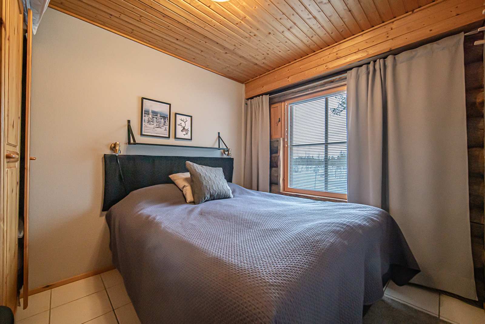 | Makuuhuone | Seinät: maalattu, puu Lattia: laatta |