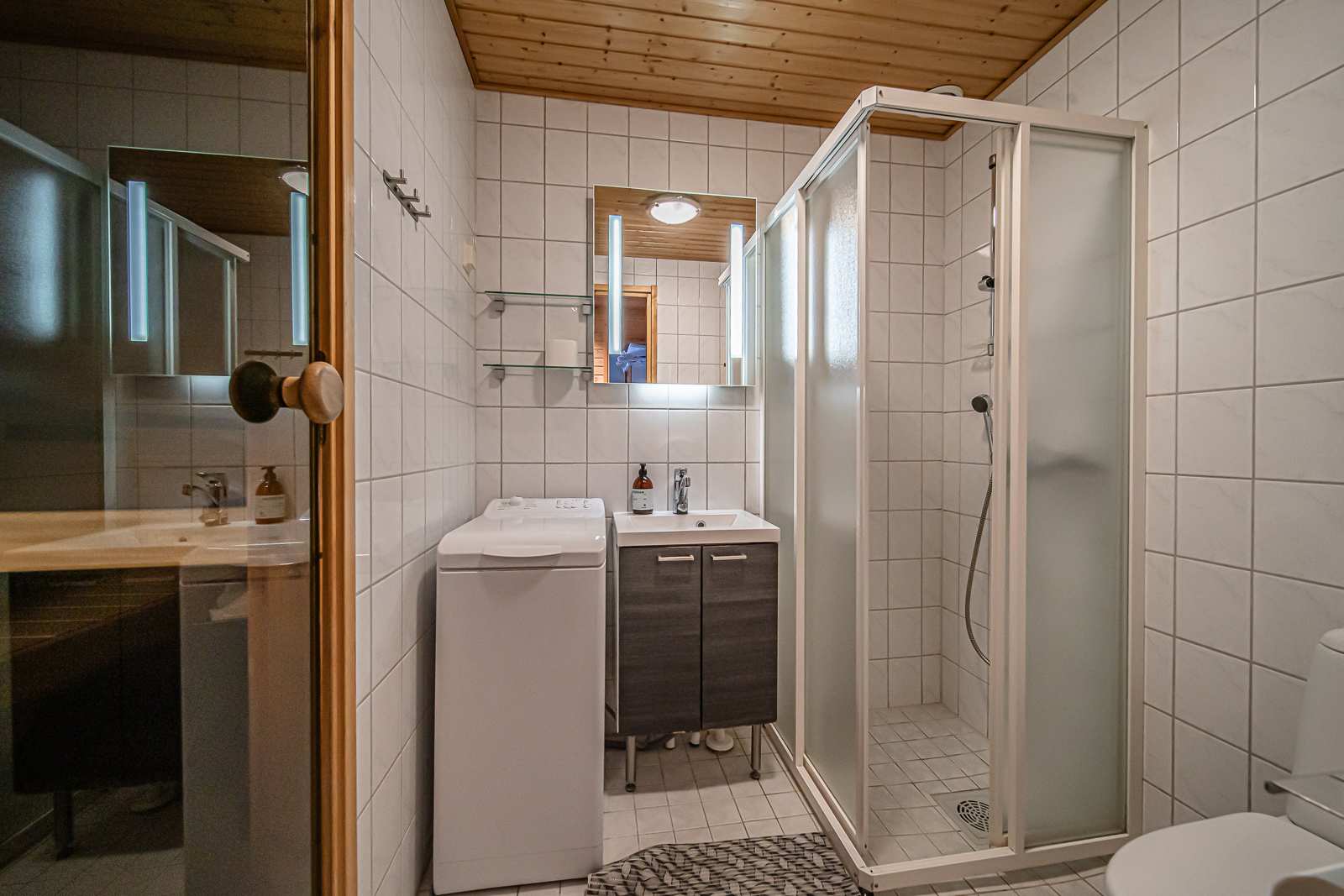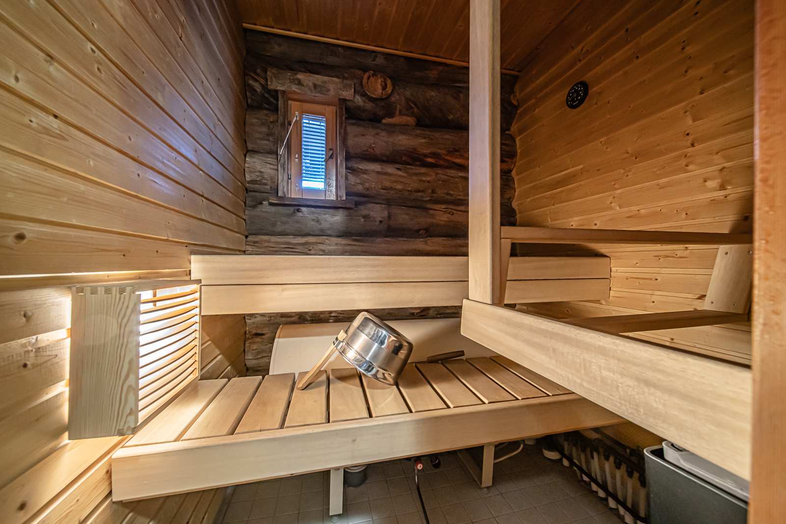 | Saunan pinnat | Seinät: puu Lattia: laatta |