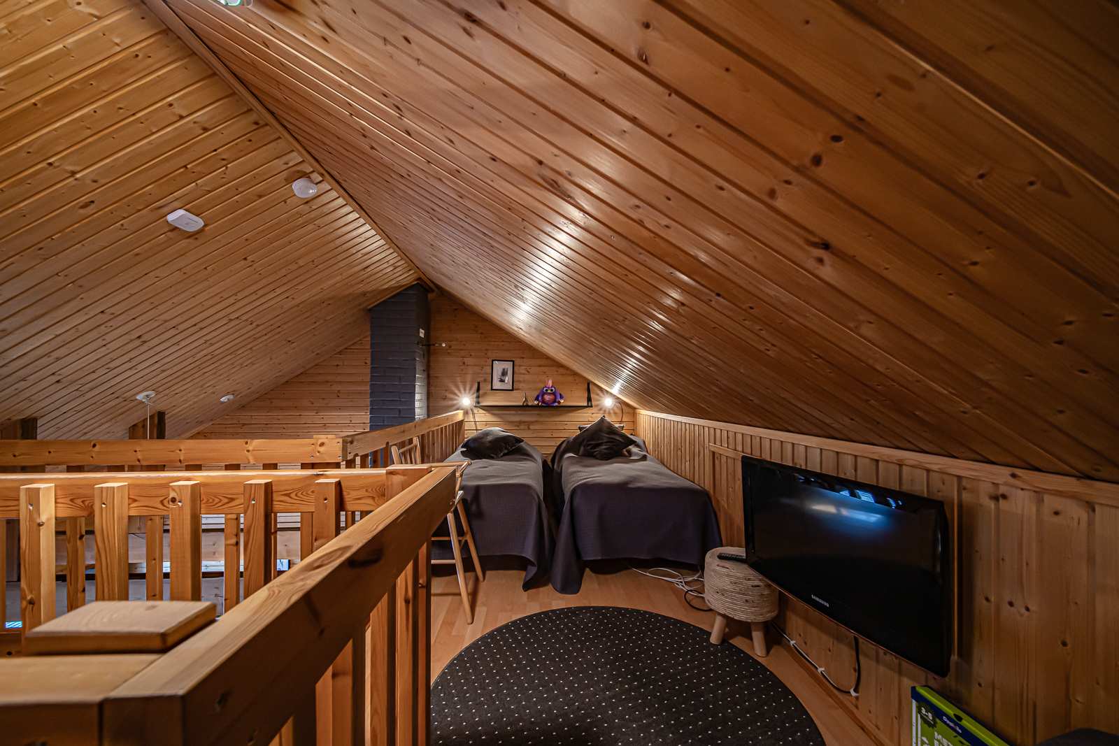 Kaunis ja kodikas lomahuoneisto. Makuutilat jopa seitsemälle hengelle. Alakerrassa yksi makuuhuone, tupakeittiö, kylpyhuone, wc, sauna, eteinen. Parvi jossa erillinen wc. Eteisessä kuivauskaappi ja pyykinpesukone kylpyhuoneessa. Ulkovarasto huoneiston yhteydessä sekä lisäksi erillinen yhtiön huoltotila. Takapihalla terassi.