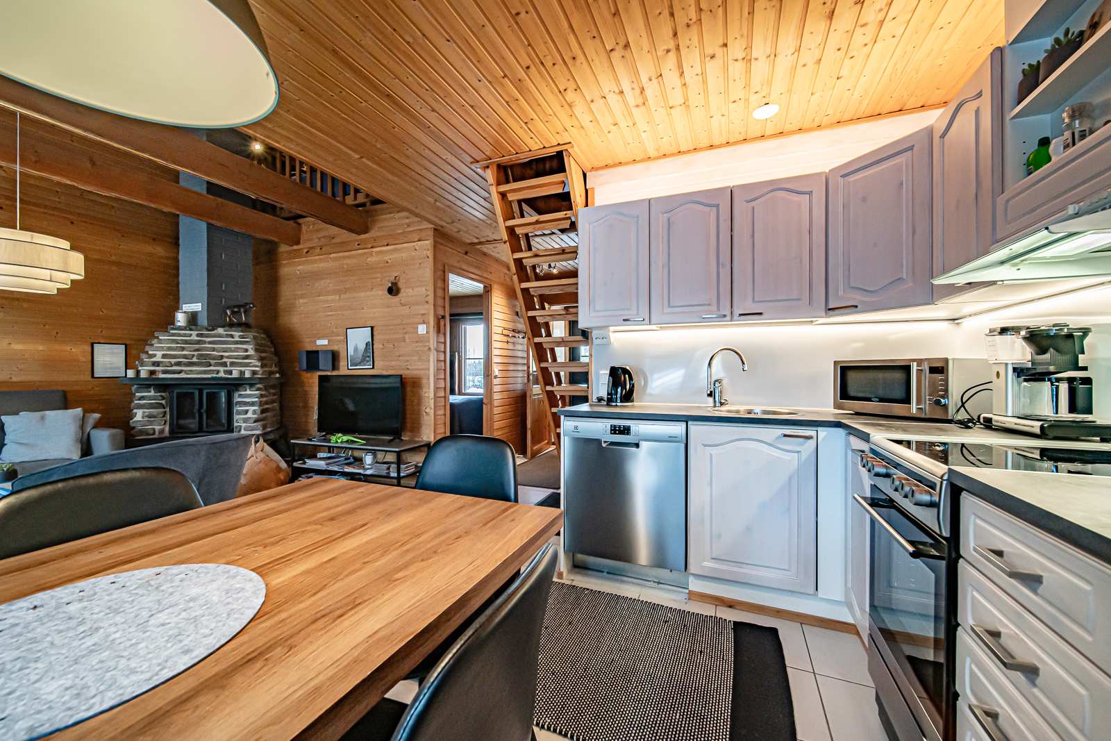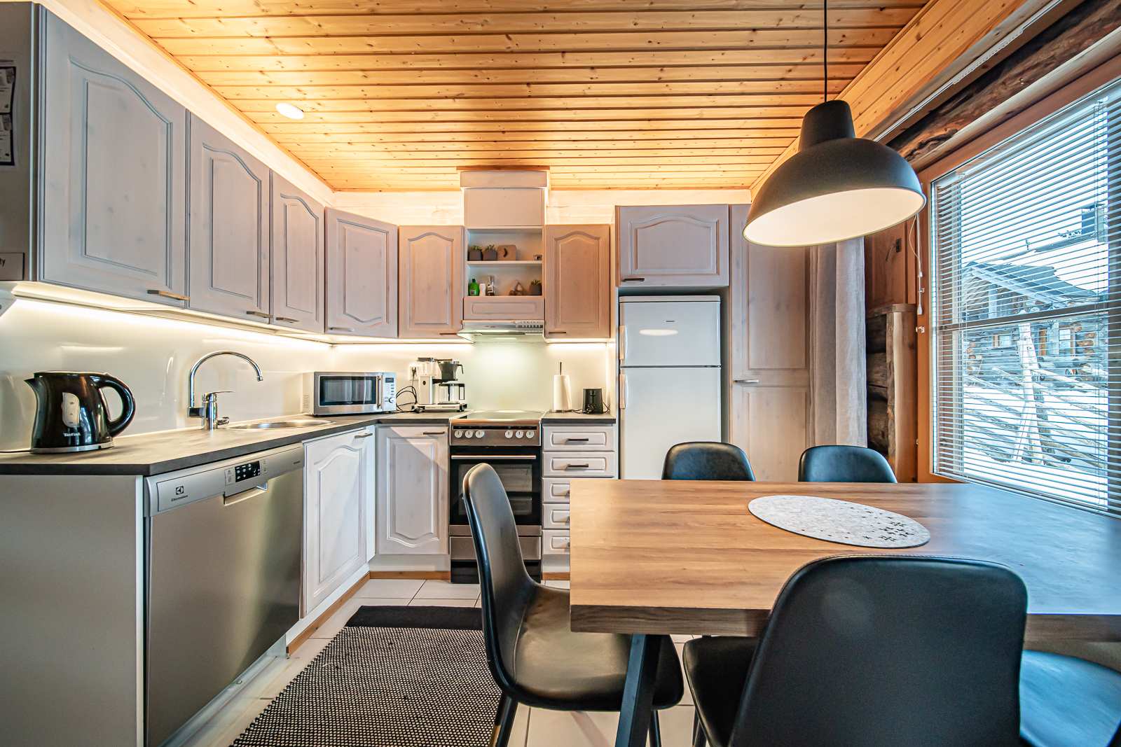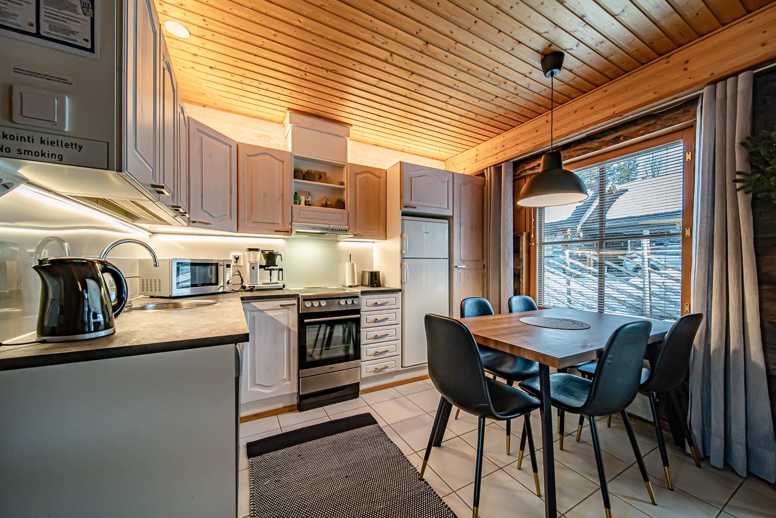 | Keittiön varustus | Jääkaappi ja pakastin: jääkaappi/pakastin Muut varusteet: liesituuletin, mikroaaltouuni, astianpesukone Tasot: laminaatti Seinät: puu Lattia: laatta Liesi/uuni: sähköliesi |