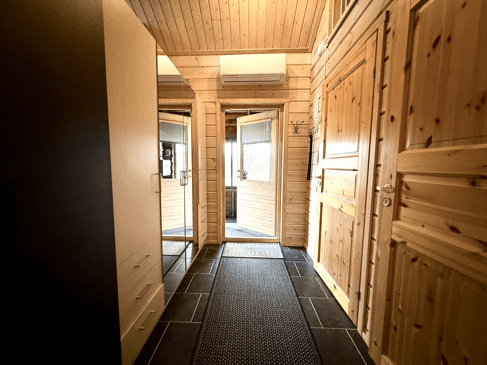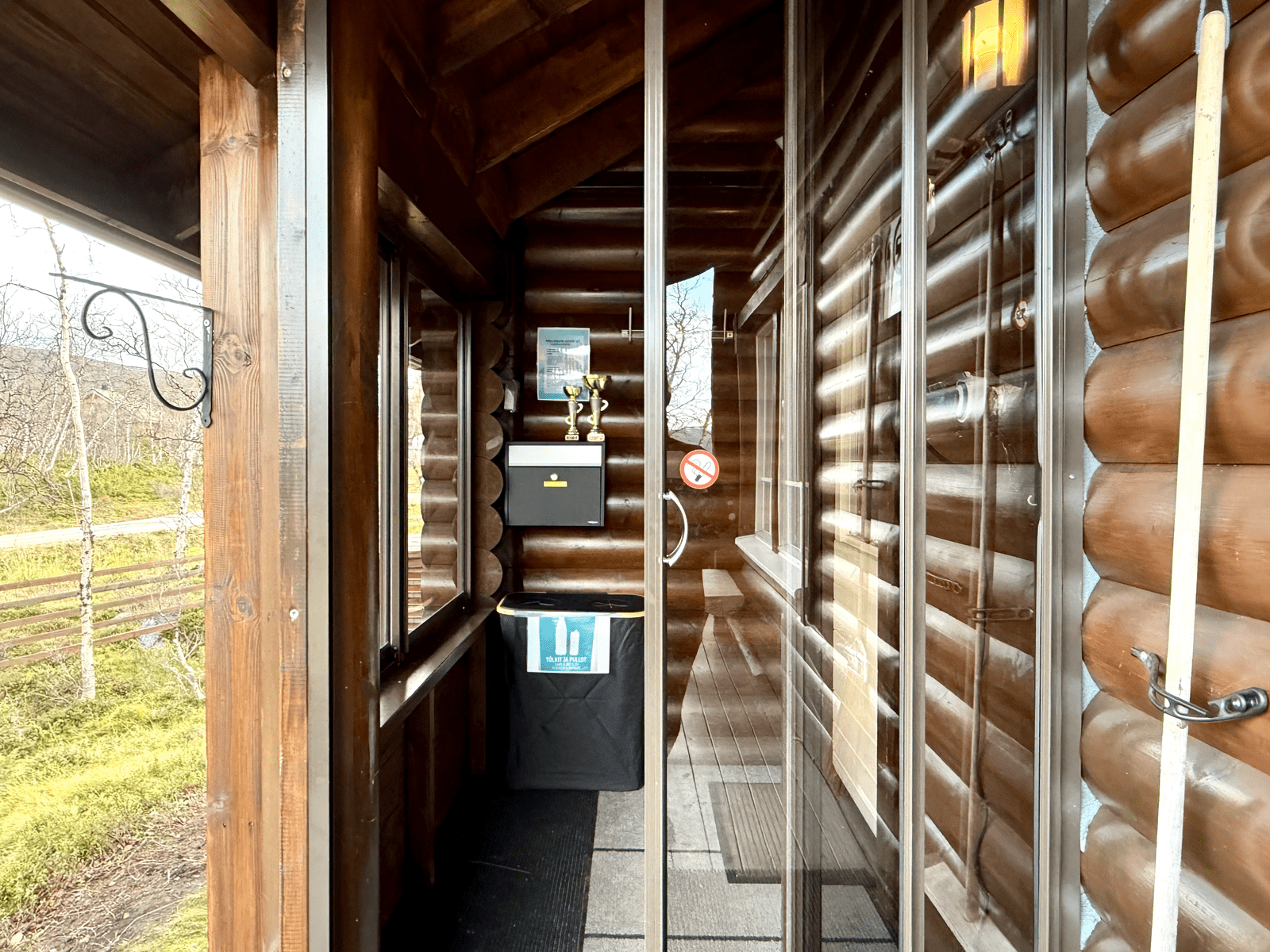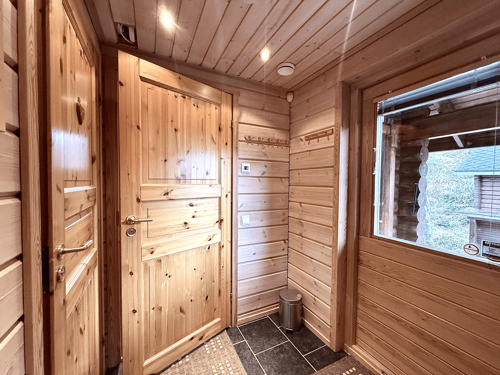 | Saunan kuvaus | Saunan pukuhuoneesta käynti terassille. |