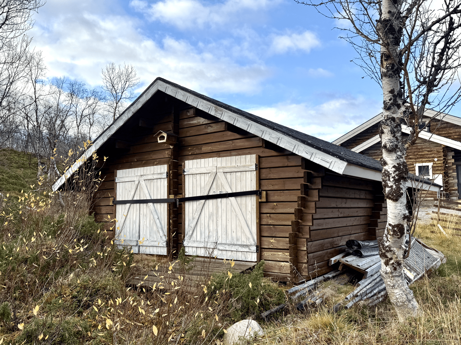 Pihalla tulistelukota sekä yhteinen kelkkavarasto naapurin kanssa.