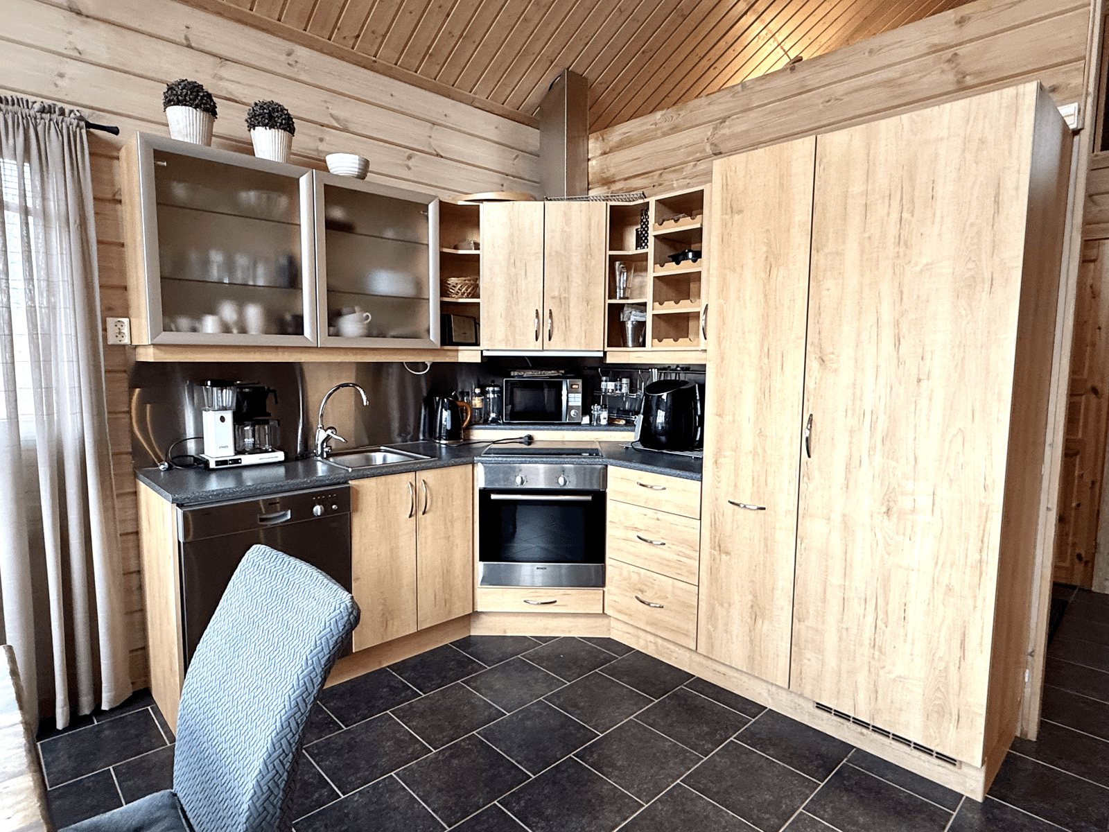| Keittiön varustus | Jääkaappi ja pakastin: jääkaappi Tasot: laminaatti Seinät: puu Lattia: laatta Muut varusteet: liesituuletin, mikroaaltouuni, astianpesukone Liesi/uuni: integroitu, erillisuuni |
