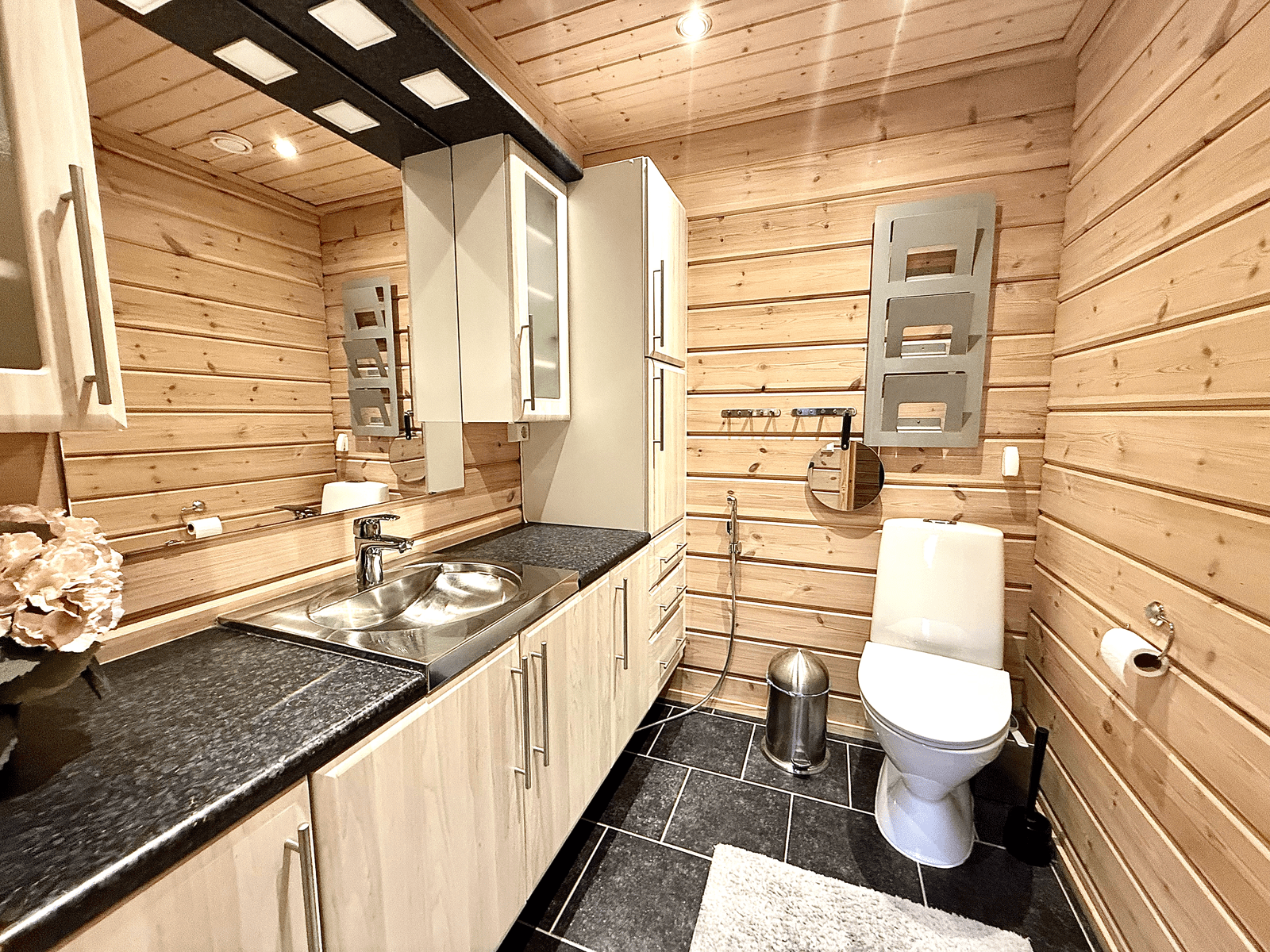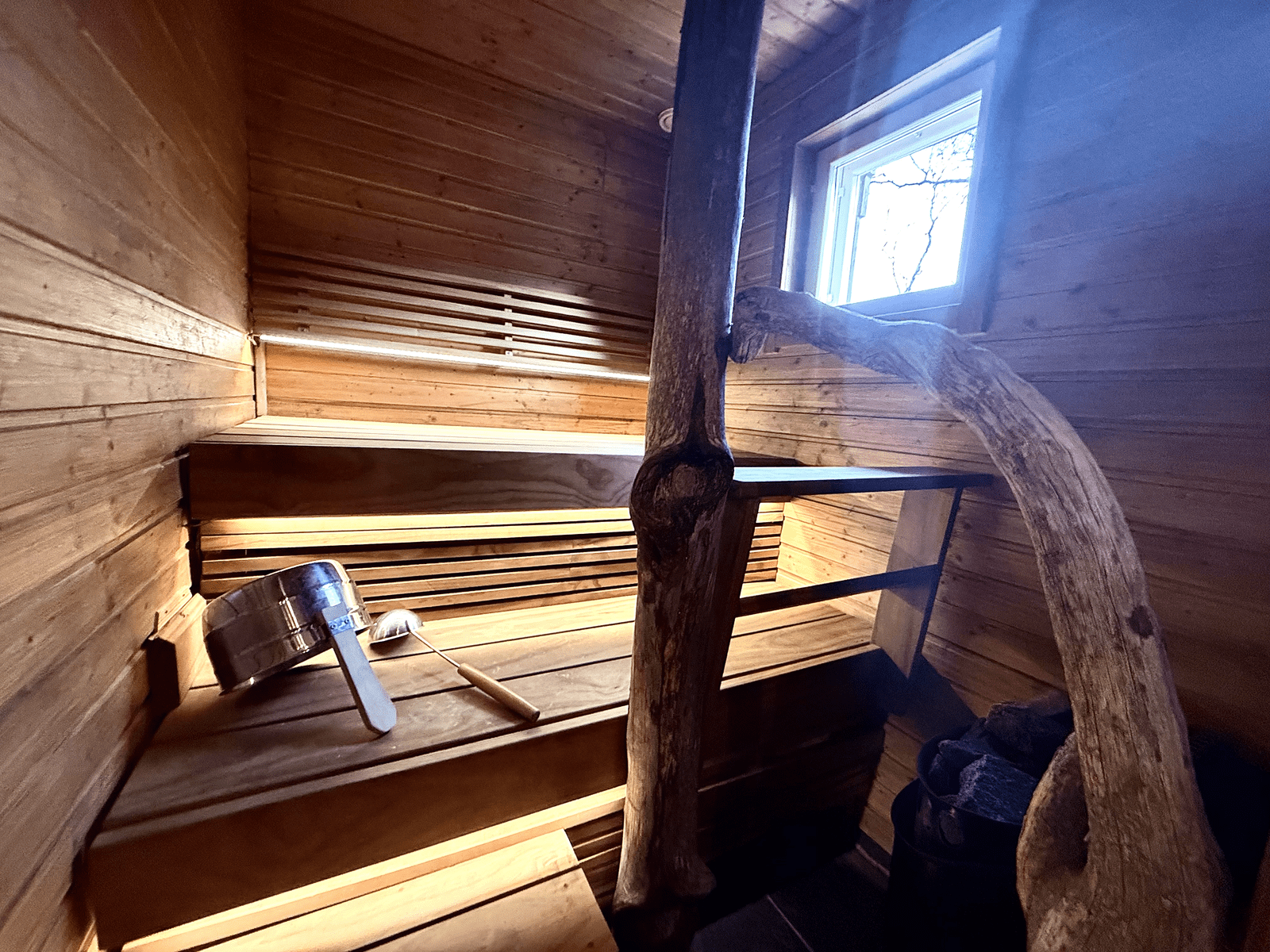 | Saunan pinnat | Seinät: puu Lattia: laatta |