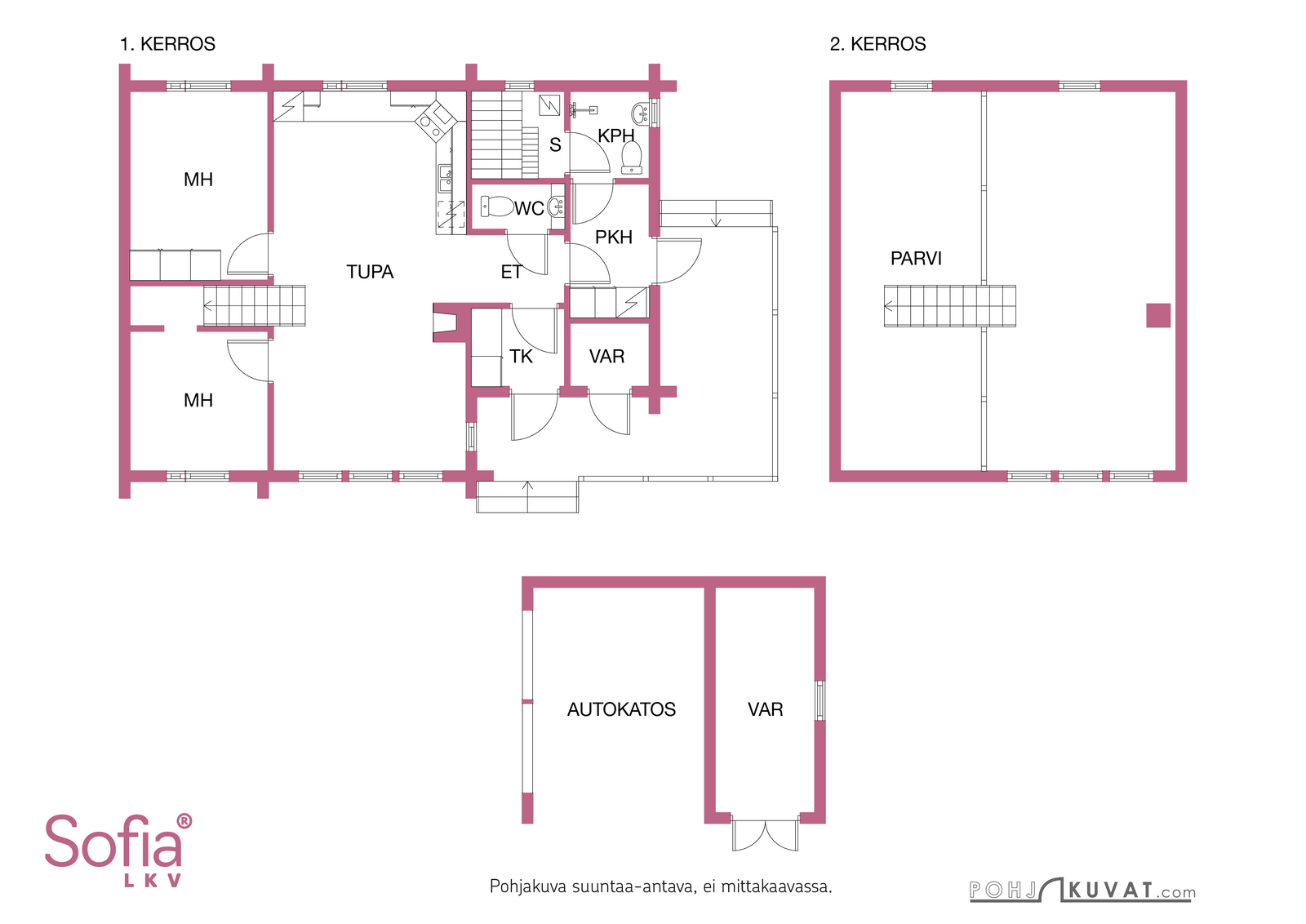 | Lisätietoja pinta-alasta | Kerrosala 90,8m2: 1.kerros 81m2, parvi 9,2m2. Huoneistoala 76,5m2: 1.kerros 67,5m2, parvi 8,9m2. Varasto 2m2. Autokatos kerrosala 15m2, huoneistoala 11,5m2. Pinta-alat rakennuspiirustuksista. |