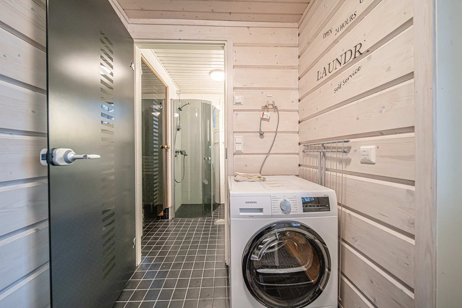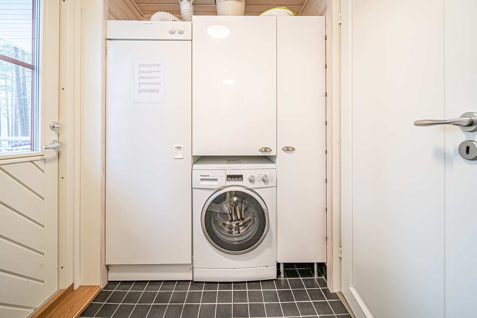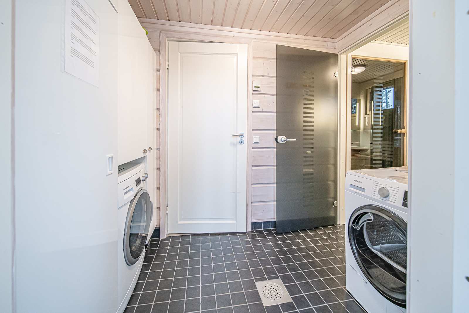 | Kodinhoitohuone | Seinät: puu Varusteet: pesukone, kuivausrumpu, kuivauskaappi, lattialämmitys Lattia: laatta |