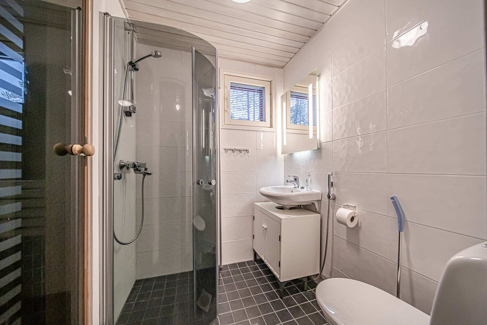 | Saunan pinnat | Seinät: puu Lattia: laatta |