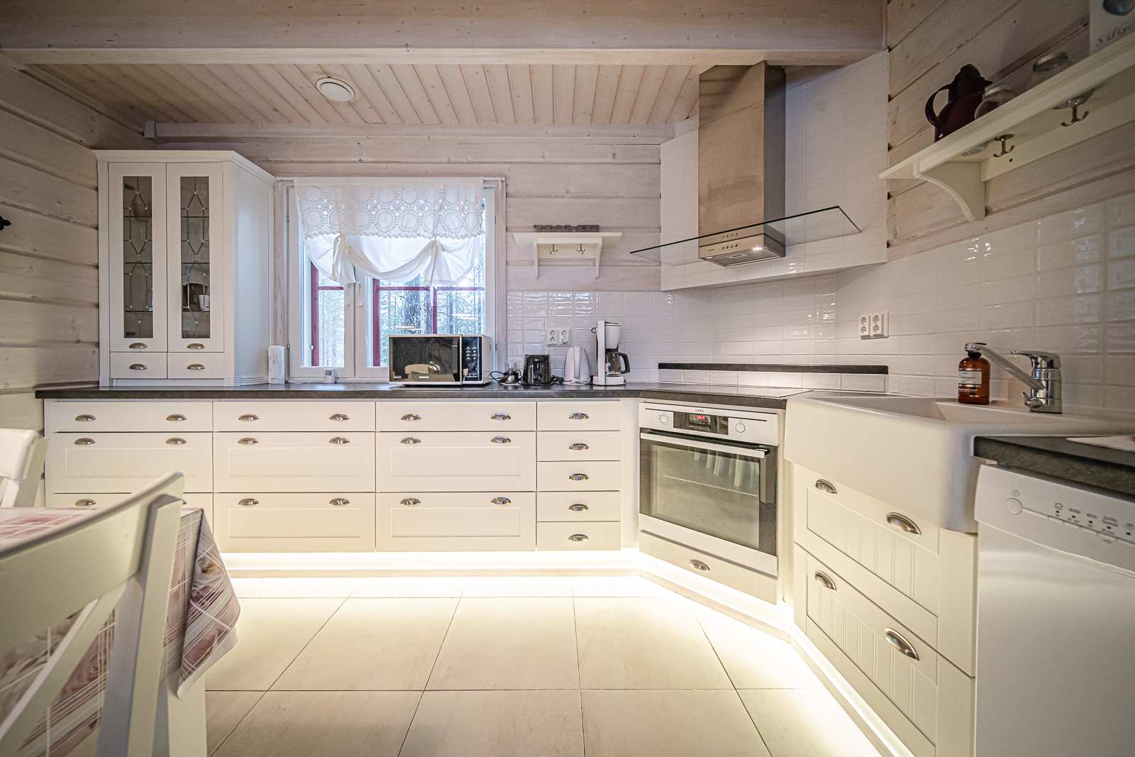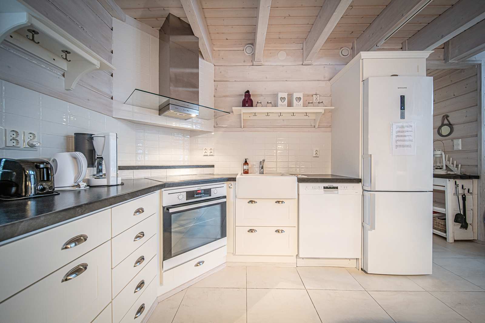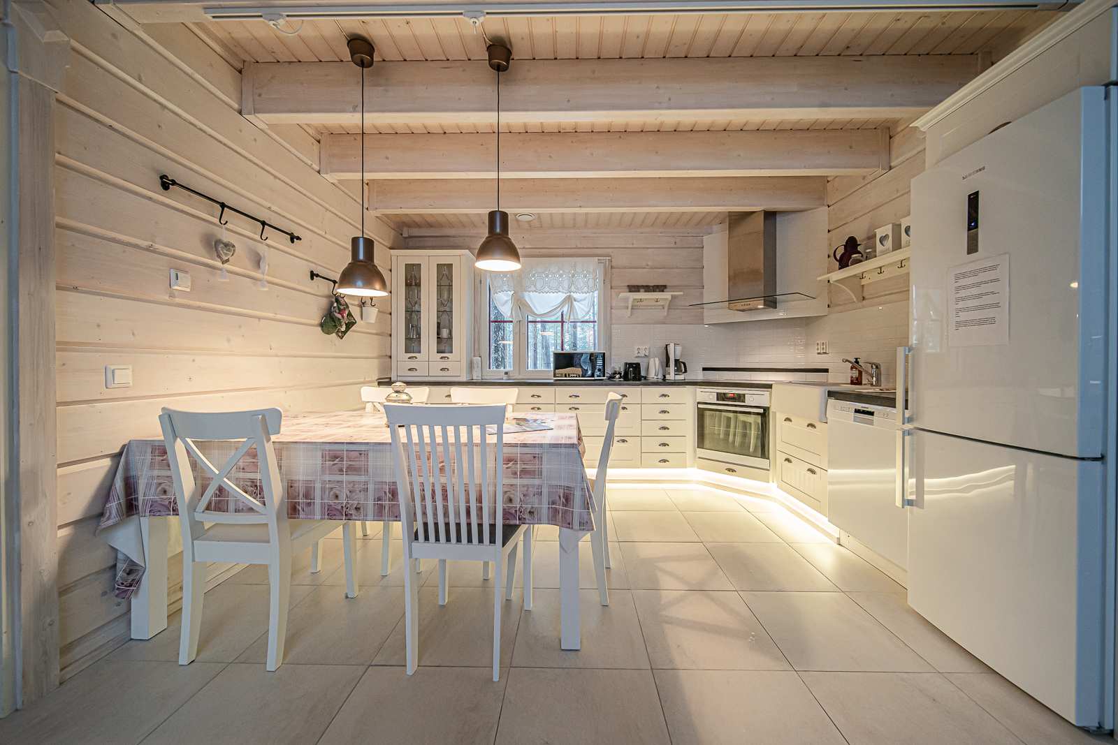 | Keittiön varustus | Jääkaappi ja pakastin: jääkaappi/pakastin Tasot: laminaatti Seinät: puu Lattia: laatta Muut varusteet: liesituuletin, astianpesukone Liesi/uuni: integroitu, erillisuuni |