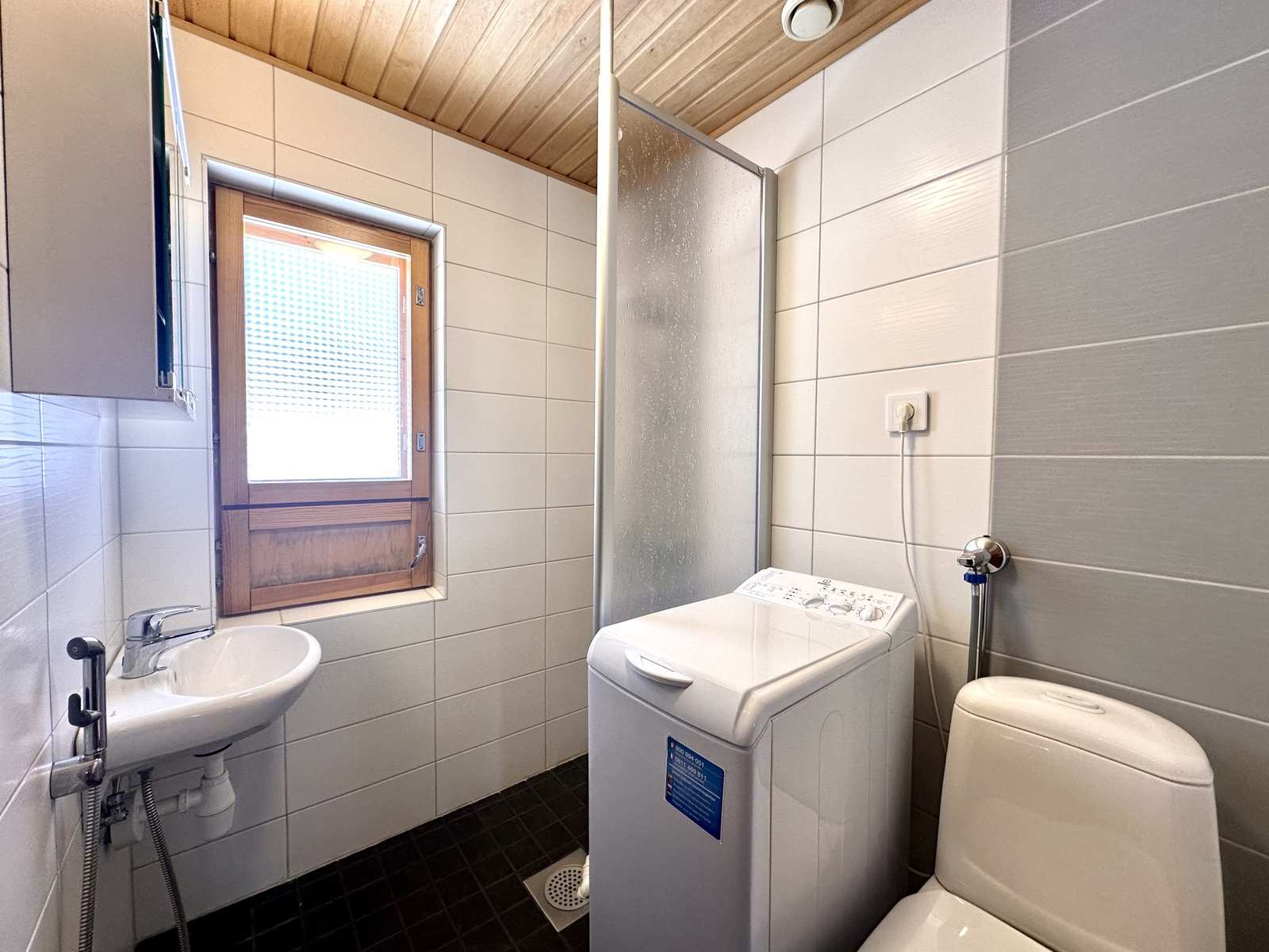 | Kylpyhuone | Varusteet: pesukone, pesukoneliitäntä, suihku Seinät: kaakeli Lattia: laatta |
