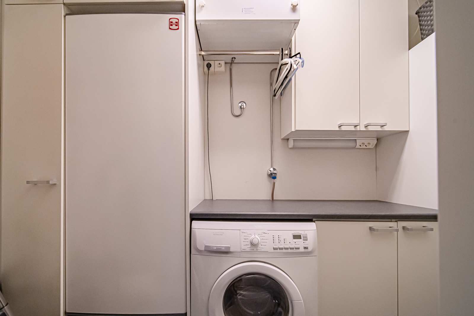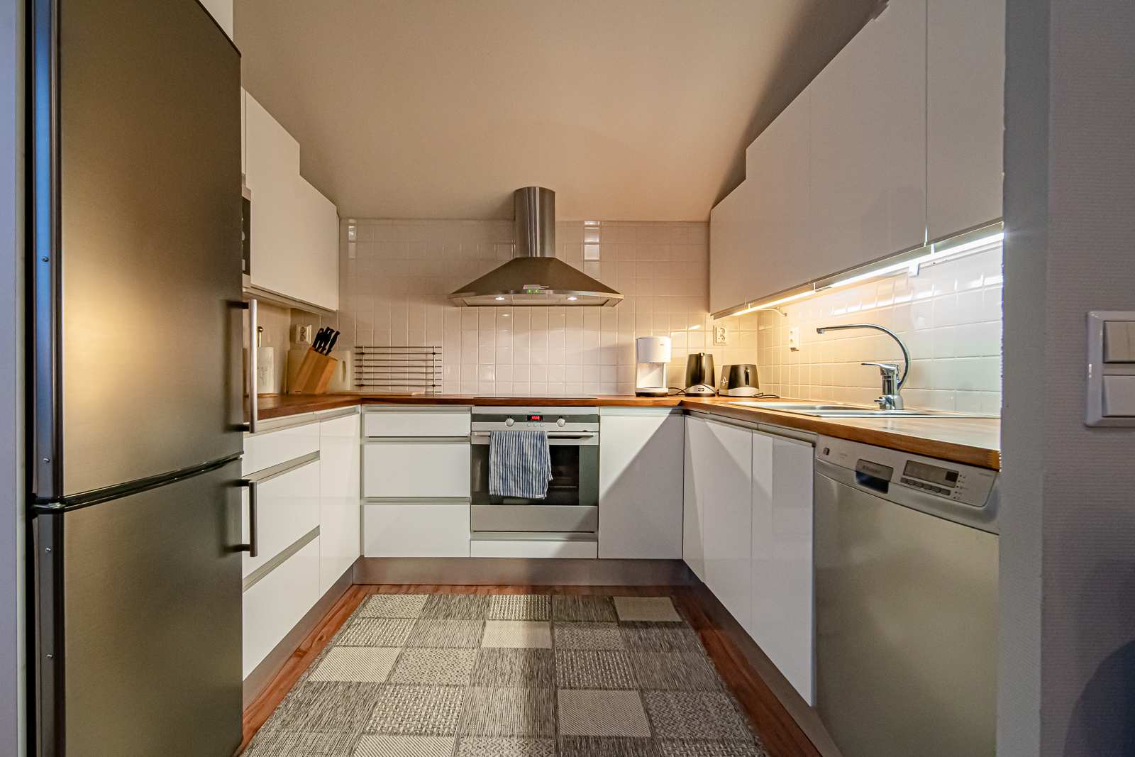 | Keittiön varustus | Jääkaappi ja pakastin: jääkaappi/pakastin Tasot: puu Seinät: maalattu Lattia: laminaatti Muut varusteet: liesituuletin, mikroaaltouuni, astianpesukone Liesi/uuni: keraaminen, erillisuuni |