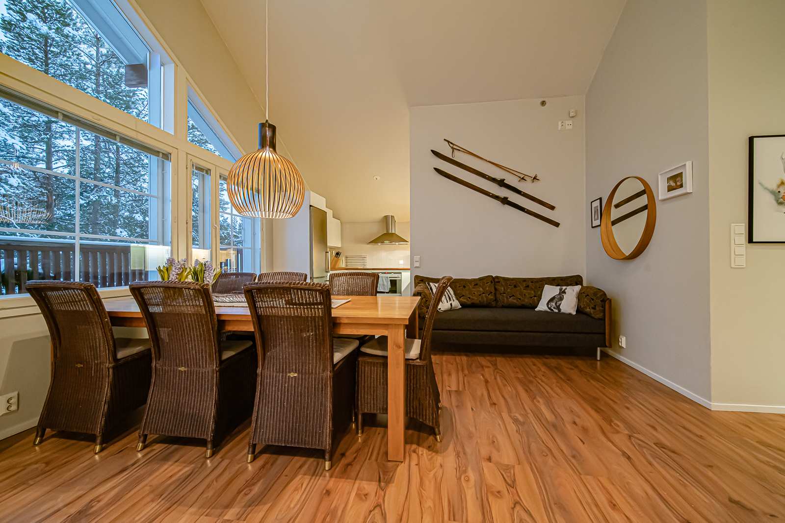 Huoneistossa kolme makuuhuonetta, olohuone, keittiö, kolme wc:tä, kylpyhuone, sauna, kodinhoitotila, vaatehuone. Myydään kalustettuna irtaimistoineen. Huoneistokohtainen häkkivarasto kellarissa. Levin palvelut, hiihtoladut, laskettelurinteet ja muut aktiviteetit lähellä.