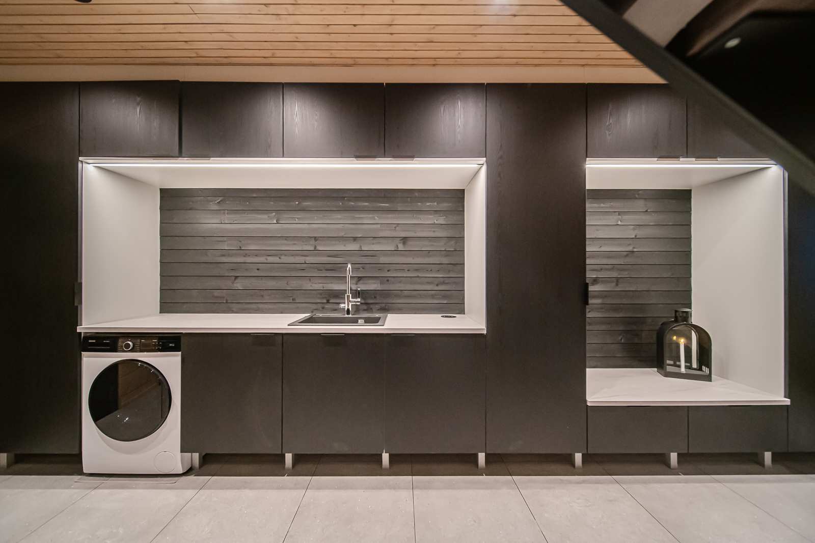 | Kodinhoitohuone | Seinät: maalattu, puu Varusteet: pesukone, pesukoneliitäntä, kuivauskaappi, pesuallas, lattialämmitys, lattiakaivo Lattia: laatta |
