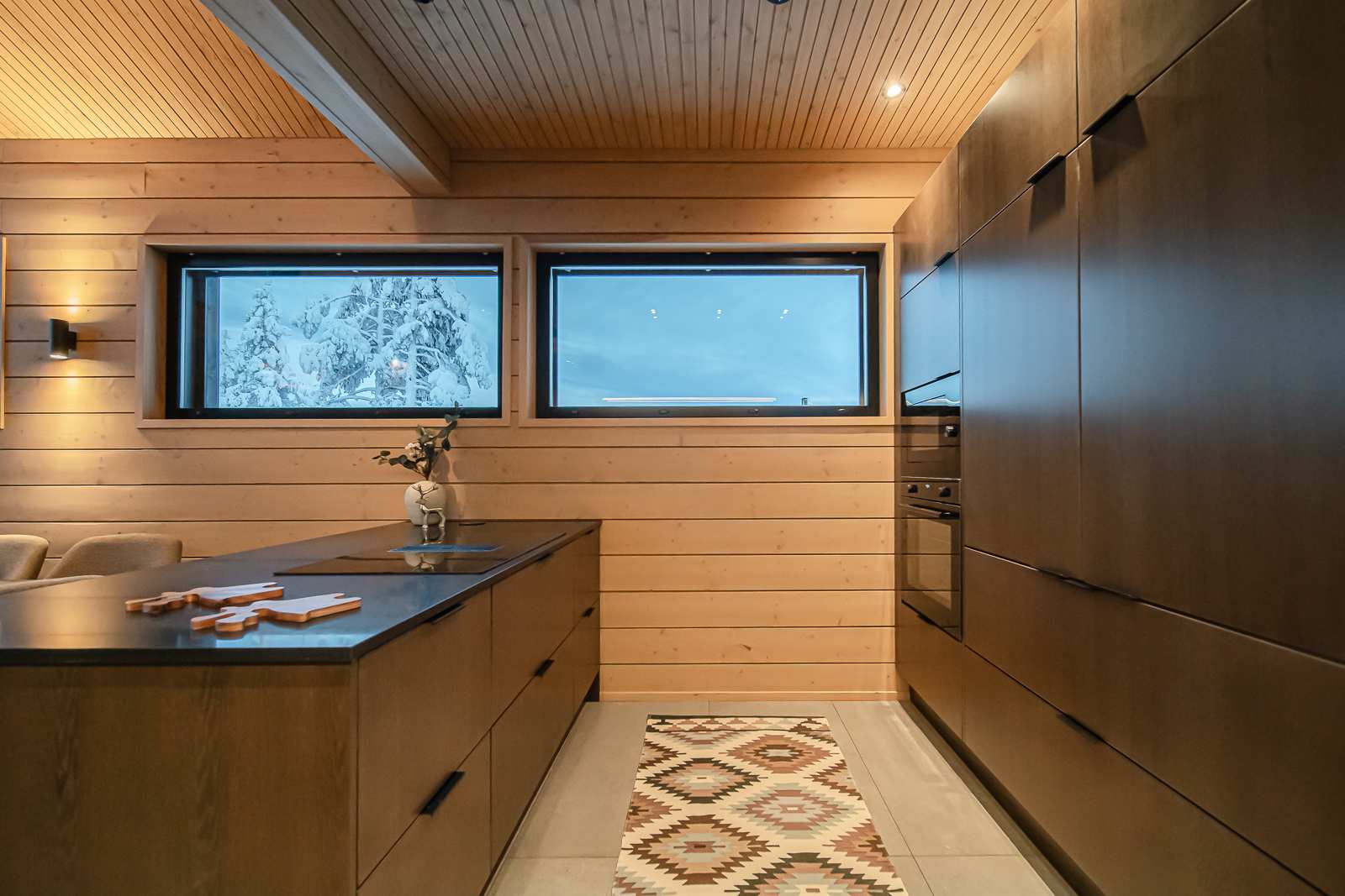 | Keittiön varustus | Jääkaappi ja pakastin: jääkaappi/pakastin Seinät: puu Lattia: laatta Muut varusteet: mikroaaltouuni, astianpesukone Liesi/uuni: integroitu, induktio, erillisuuni |