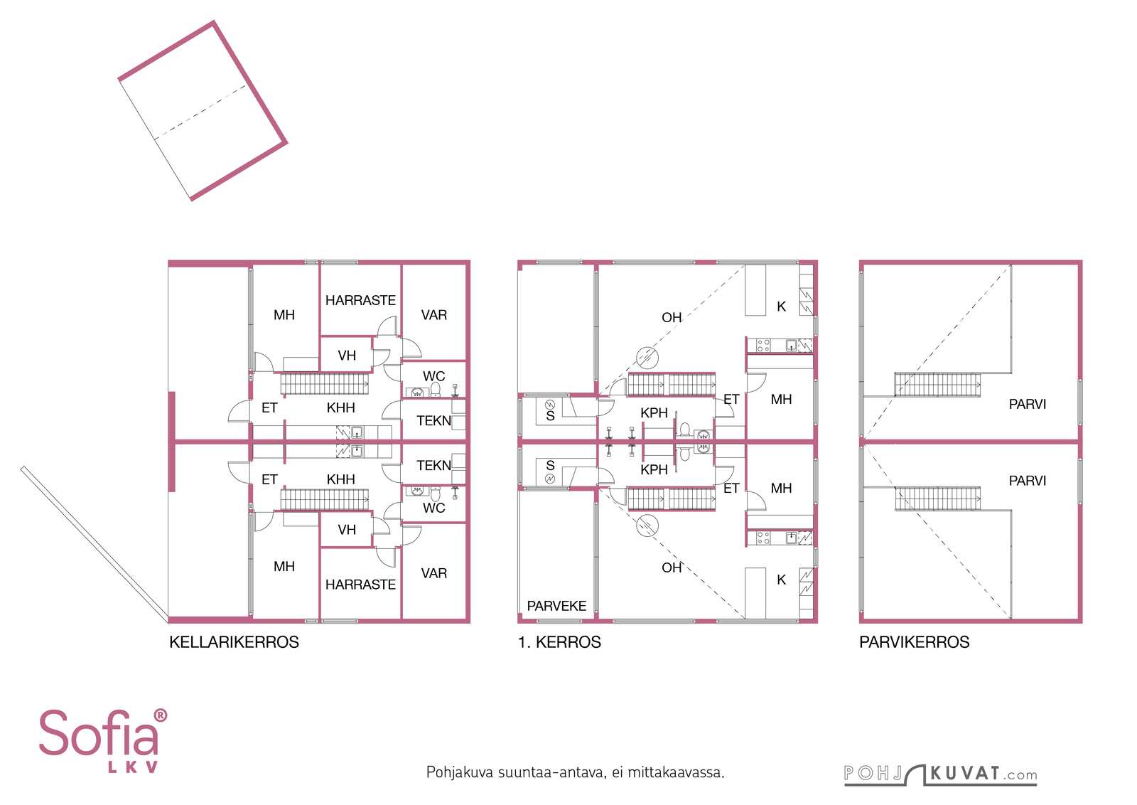 | Lisätietoja pinta-alasta | Pääkerros, kellarikerros ja parvi. A-puoli Huoneistoala 104m2, kerrosala 105,5, kokonaisala 177m2. B-puoli Huoneistoala 104m2, kerrosala 105,5, kokonaisala 177m2. Yhteensä Huoneistoala 208m2, kokonaisala 354m2. |