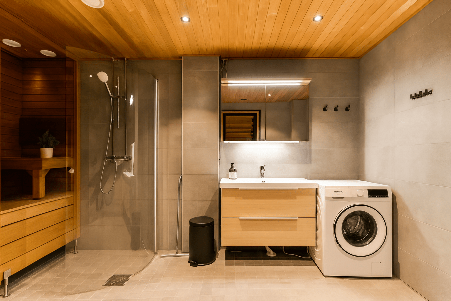 | Saunan pinnat | Seinät: puu Lattia: laatta |