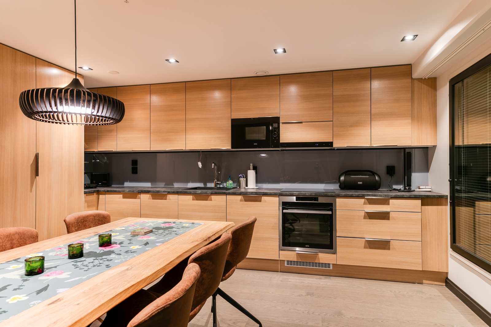 | Keittiön varustus | Jääkaappi ja pakastin: jääkaappi/pakastin Tasot: laminaatti Seinät: maalattu Lattia: laminaatti Muut varusteet: liesituuletin, mikroaaltouuni, astianpesukone Liesi/uuni: induktio, erillisuuni |