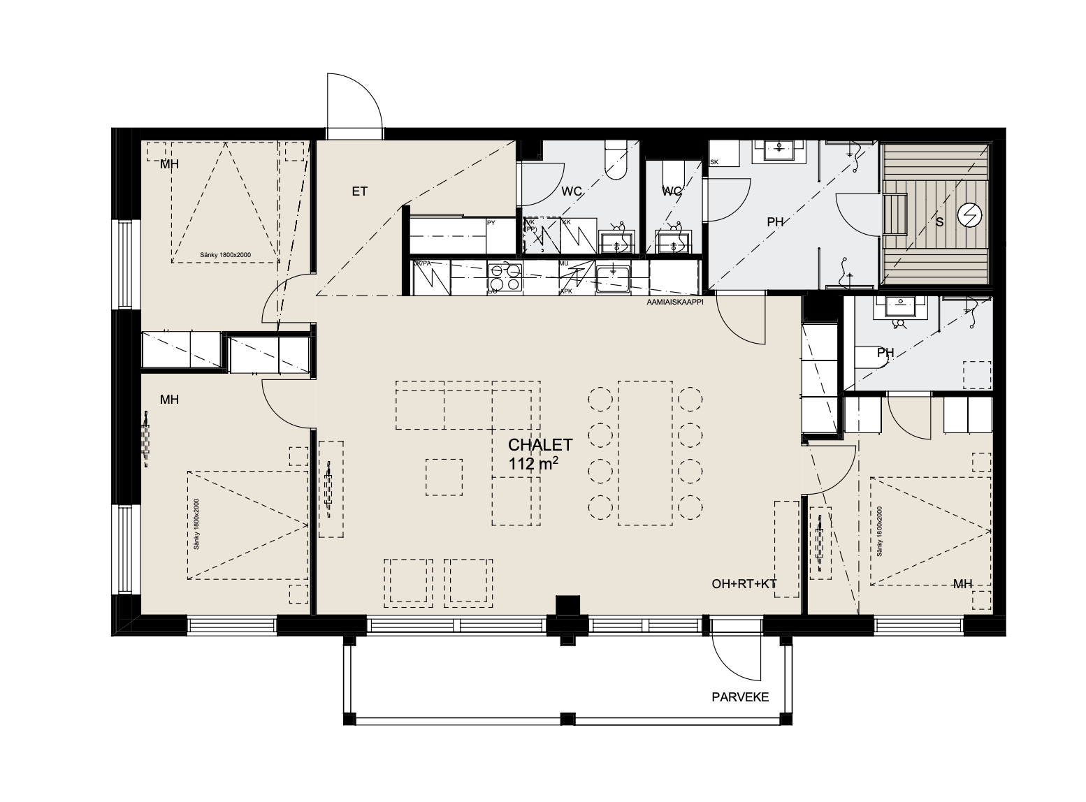 | Keittiön varustus | Jääkaappi ja pakastin: jääkaappi/pakastin Tasot: laminaatti Seinät: maalattu Lattia: muu, vinyyli Muut varusteet: mikroaaltouuni, astianpesukone, kiinteät valaisimet, liesituuletin / hormi Liesi/uuni: integroitu, induktio, erillisuuni |