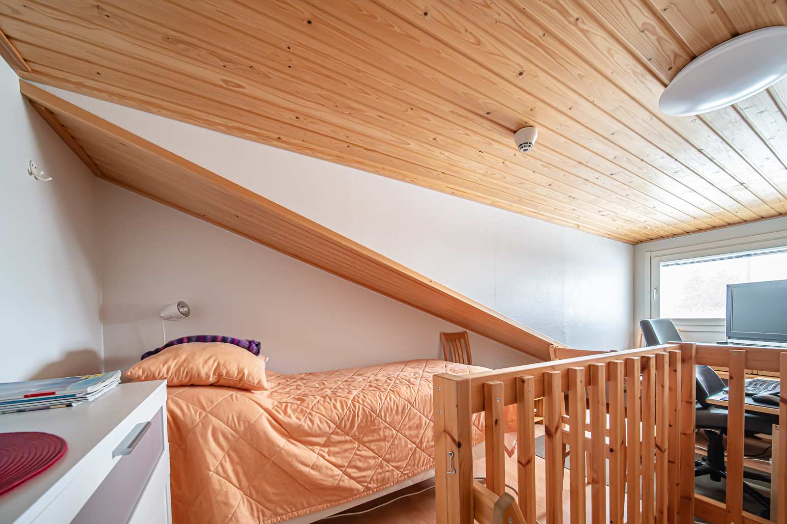Yksiössä kaikki tarpeellinen: huone, makuualkovi, keittiö, wc, kylpyhuone, sauna ja parvi. Parvella lisäksi reilunkokoinen varastotila. Toisen kerroksen asunto. Autopaikka sähköpistoketolpalla. Suksien huoltotila löytyy taloyhtiön lämpimistä tiloista, lisäksi lämmin huoneistokohtainen varasto.