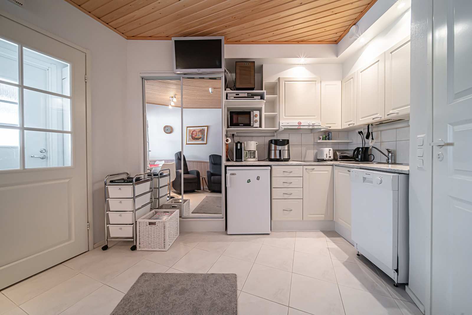 | Keittiön varustus | Jääkaappi ja pakastin: jääkaappi Muut varusteet: liesituuletin, mikroaaltouuni, astianpesukone Tasot: laminaatti Seinät: maalattu Lattia: laatta Liesi/uuni: integroitu |
