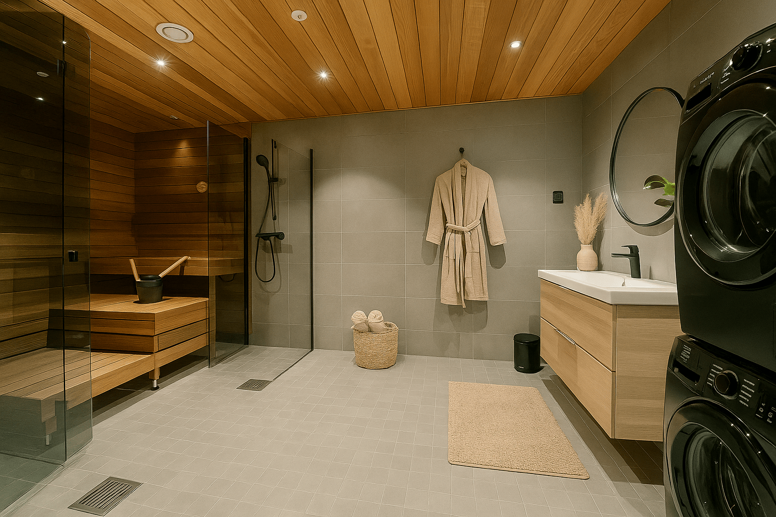 | Saunan pinnat | Seinät: puu Lattia: laatta |