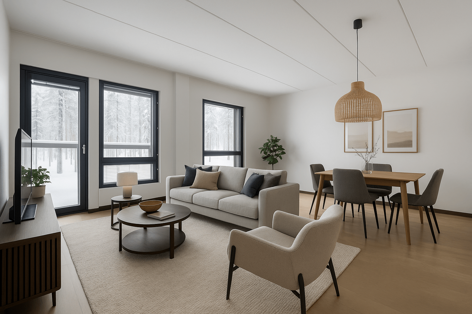 | Muuta kauppaan kuuluvaa | Sälekaihtimet/rullaverhot, verhotangot, kiinteät valaisimet, huoneistokohtainen ilmanvaihtokone |