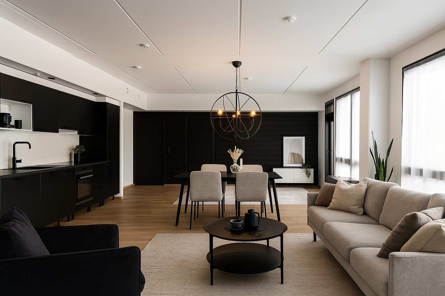 | Keittiön varustus | Jääkaappi ja pakastin: jääkaappi/pakastin Muut varusteet: mikroaaltouuni, astianpesukone, kiinteät valaisimet, liesituuletin / hormi Tasot: laminaatti Seinät: maalattu Lattia: muu, vinyyli Liesi/uuni: integroitu, induktio, erillisuuni |
