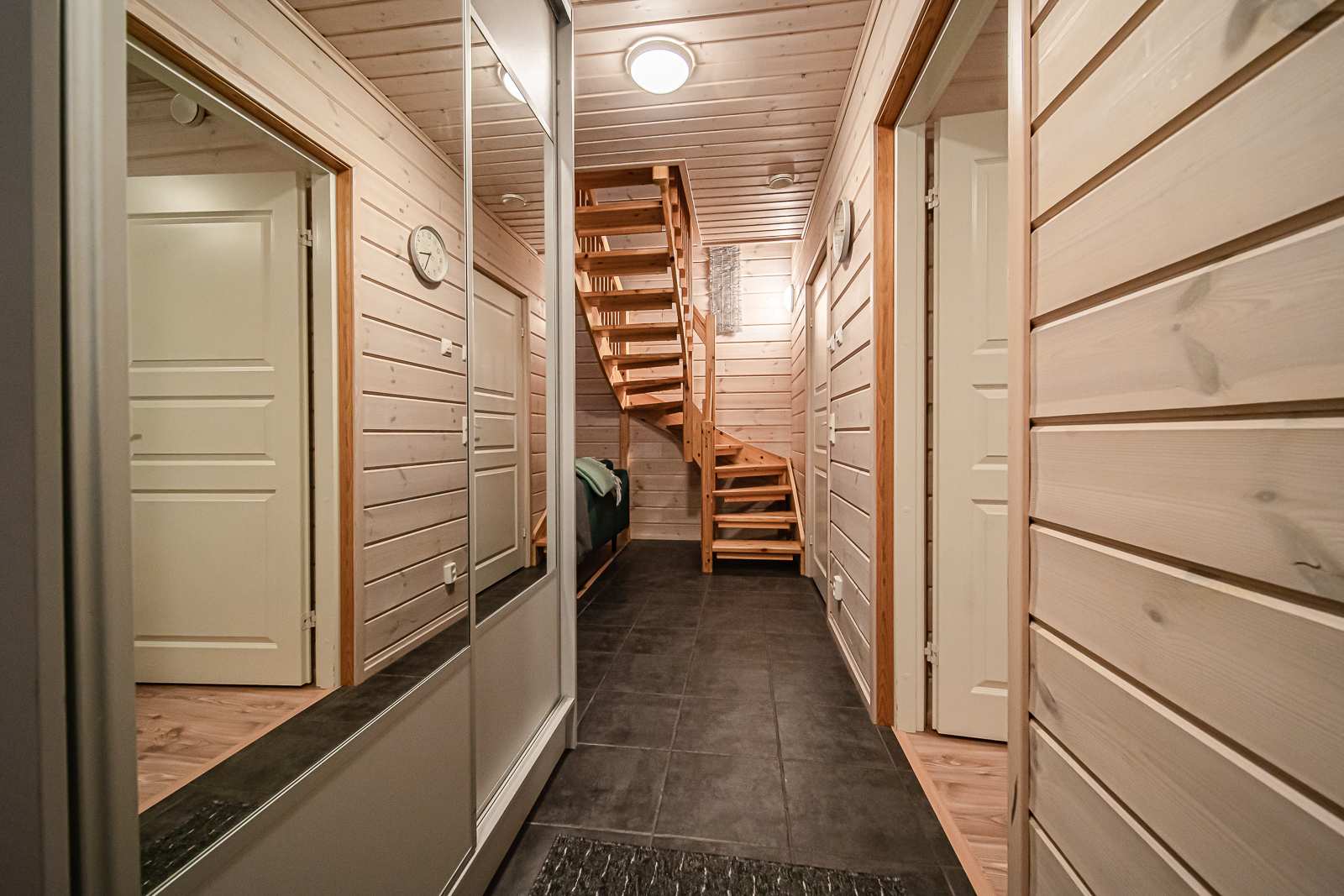 Alakerrassa tupakeittiö, yksi makuuhuone, sauna-kylpyhuone-wc. Yläkerrassa toinen makuuhuone, parvitilaa sekä erillinen wc. Kylpyhuoneessa pesukone ja kuivauskaappi.
