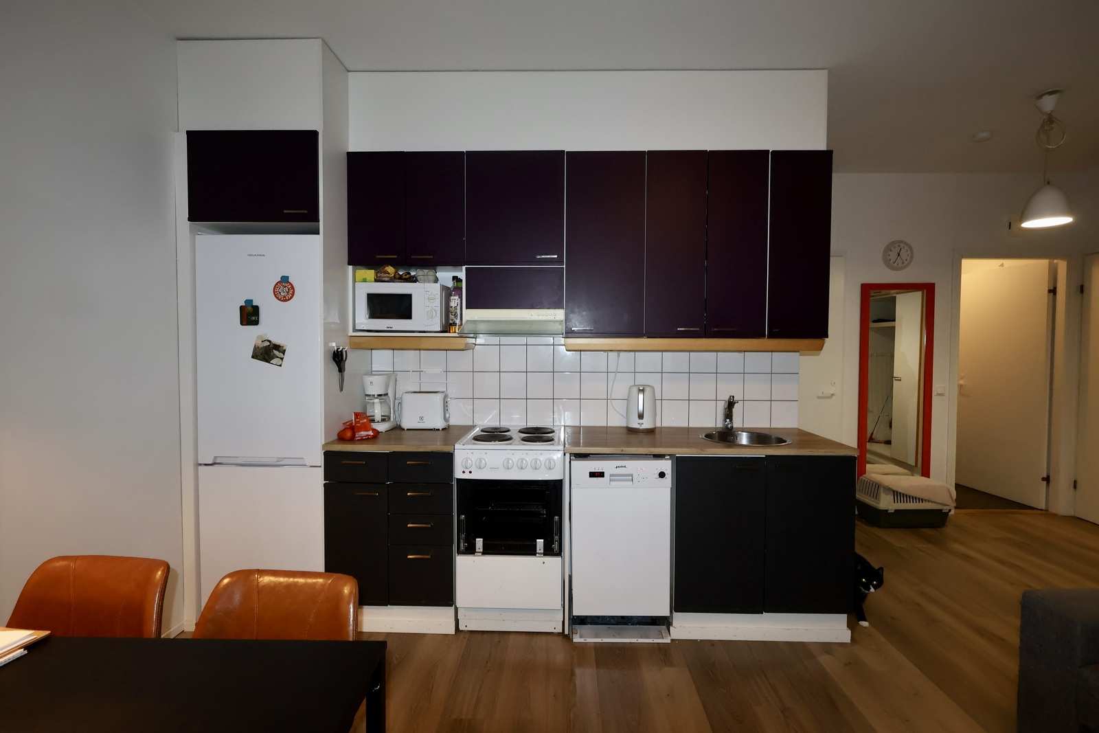 | Keittiön varustus | Jääkaappi ja pakastin: jääkaappi/pakastin Tasot: laminaatti, metalli Seinät: maalattu Lattia: laminaatti Muut varusteet: astianpesukone, liesituuletin / hormi Liesi/uuni: sähköliesi |