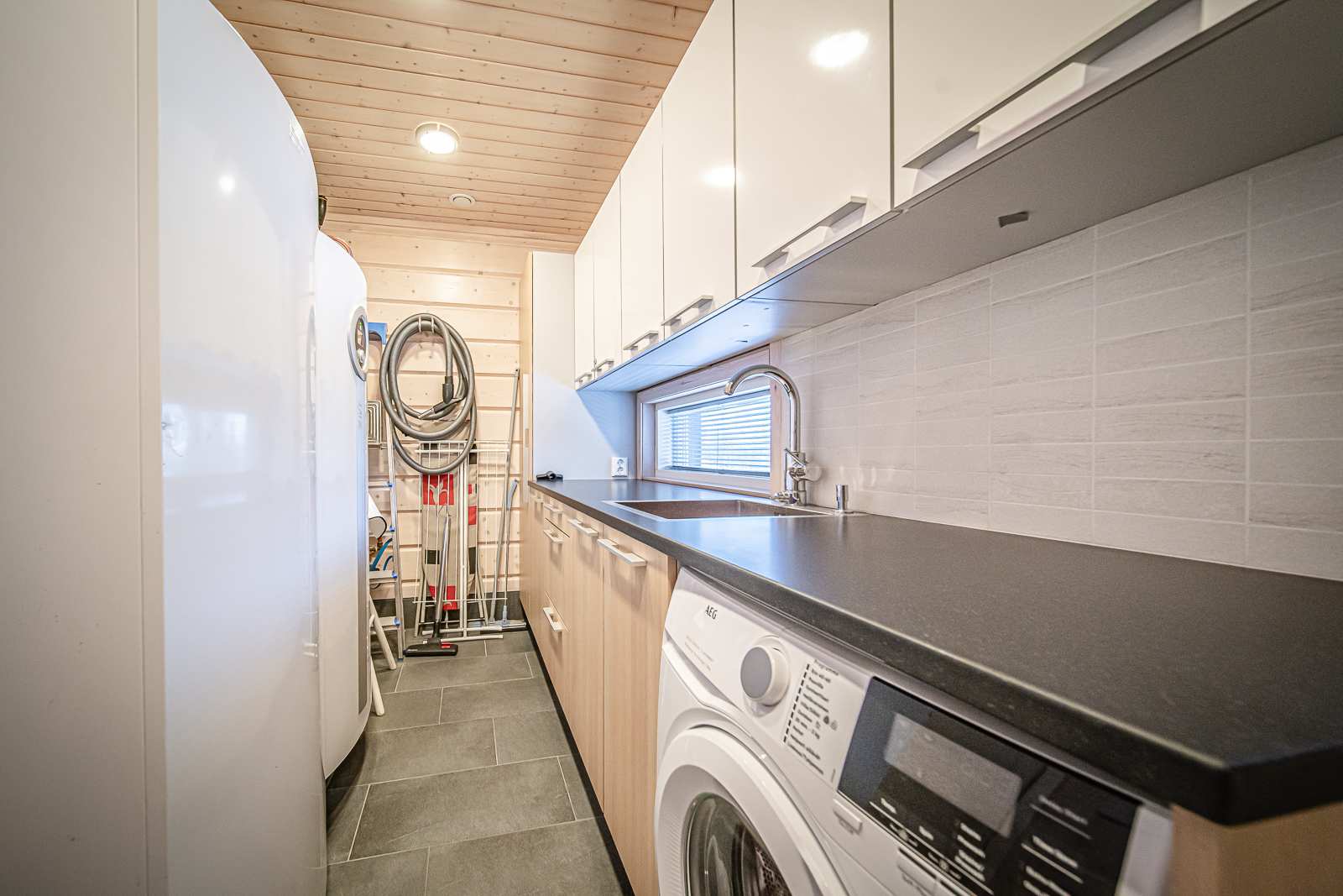 Huvilassa keittiö, olohuone, neljä makuuhuonetta, kaksi erillistä wc:tä, kodinhoitohuone, pukuhuone, kylpyhuone ja sauna. Erillinen autokatos kolmelle autolle.