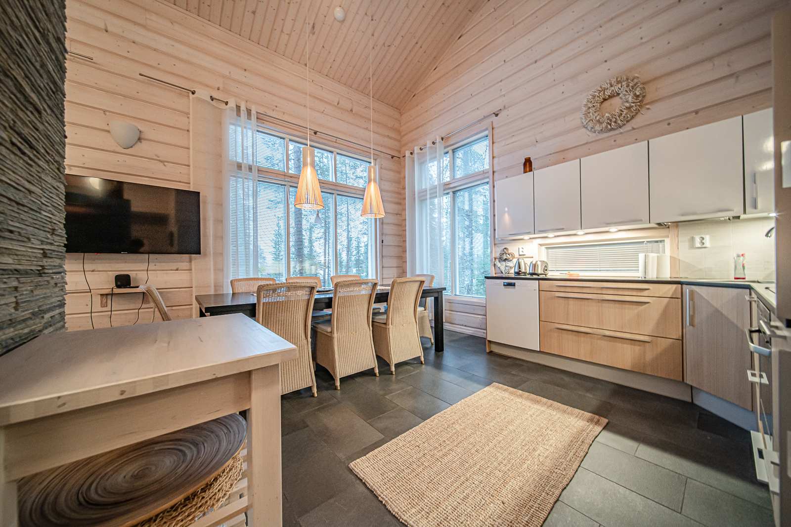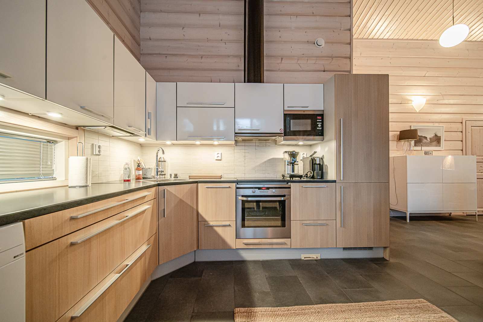 | Keittiön varustus | Jääkaappi ja pakastin: jääkaappi/pakastin Tasot: laminaatti Seinät: puu Lattia: laatta Muut varusteet: liesituuletin, mikroaaltouuni, astianpesukone Liesi/uuni: integroitu, erillisuuni |