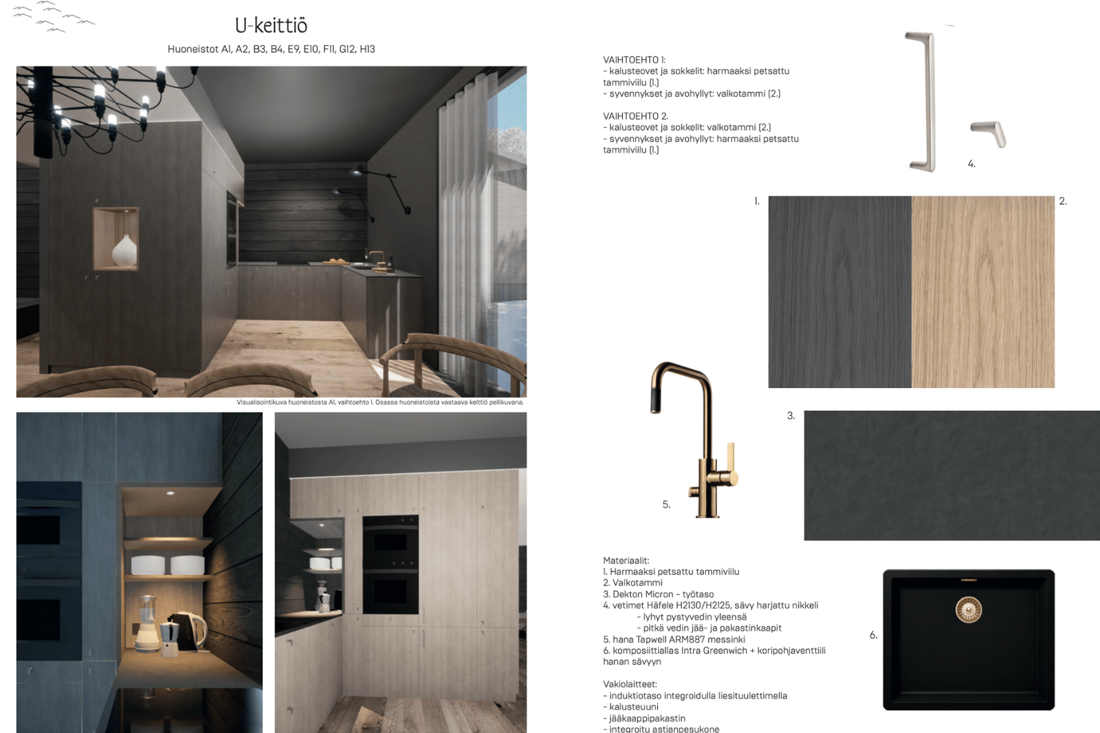 | Keittiön varustus | Jääkaappi ja pakastin: jääkaappi/pakastin Tasot: muu Seinät: maalattu, puu Lattia: parketti Muut varusteet: liesituuletin, astianpesukone Liesi/uuni: integroitu, induktio, erillisuuni |