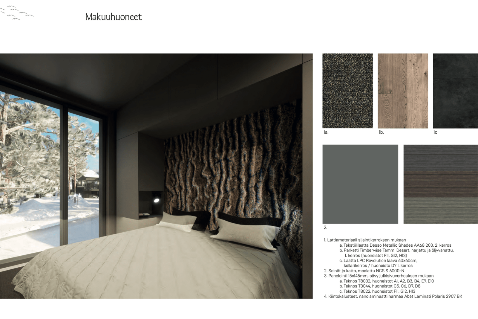| Makuuhuone | Seinät: maalattu, puu Lattia: parketti |