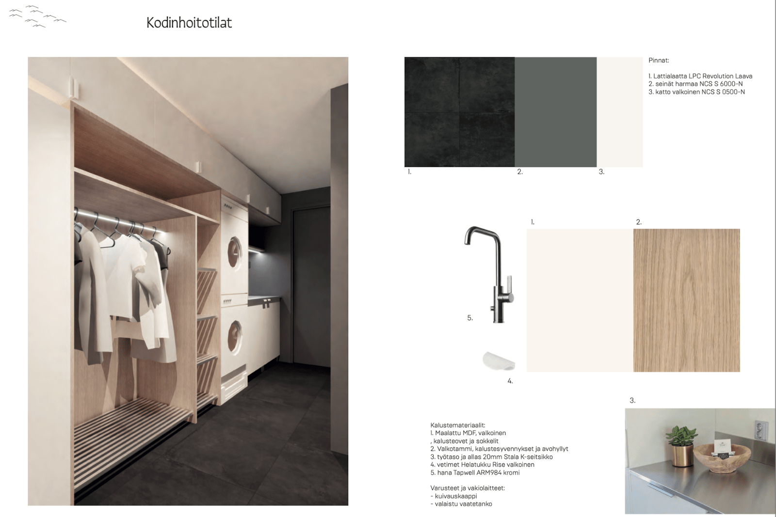 | Kodinhoitohuone | Seinät: kaakeli, maalattu Varusteet: pesukone, pesukoneliitäntä, kuivausrumpu, kuivauskaappi Lattia: laatta |