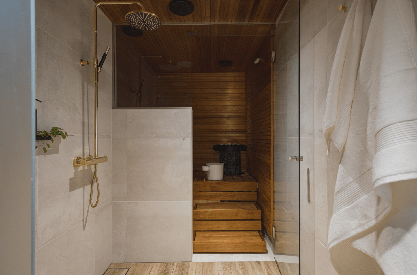 | Saunan pinnat | Seinät: puu Lattia: laatta |