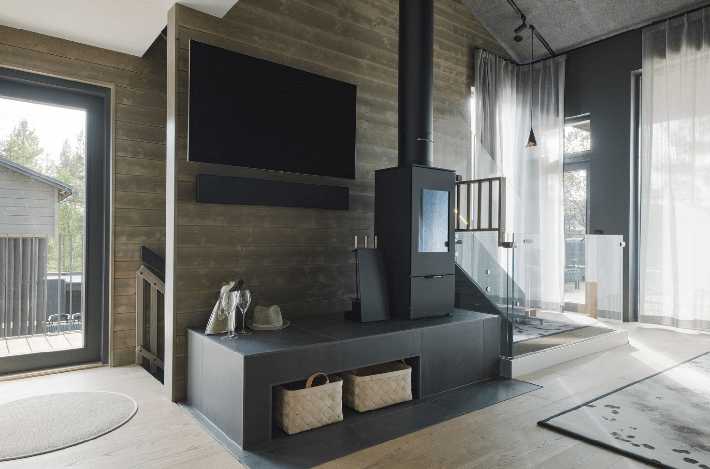 | Saunan kuvaus | Bang&Olufsen audiojärejstelmä saunaosastolla. 42m2 Kattoterassi, jossa poreallas Design allas Drop. |