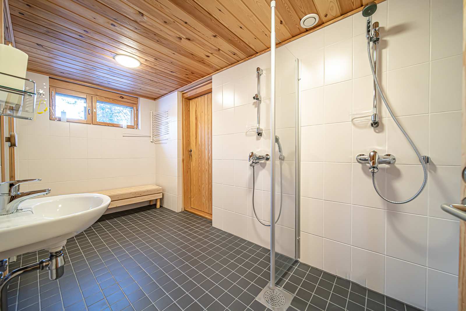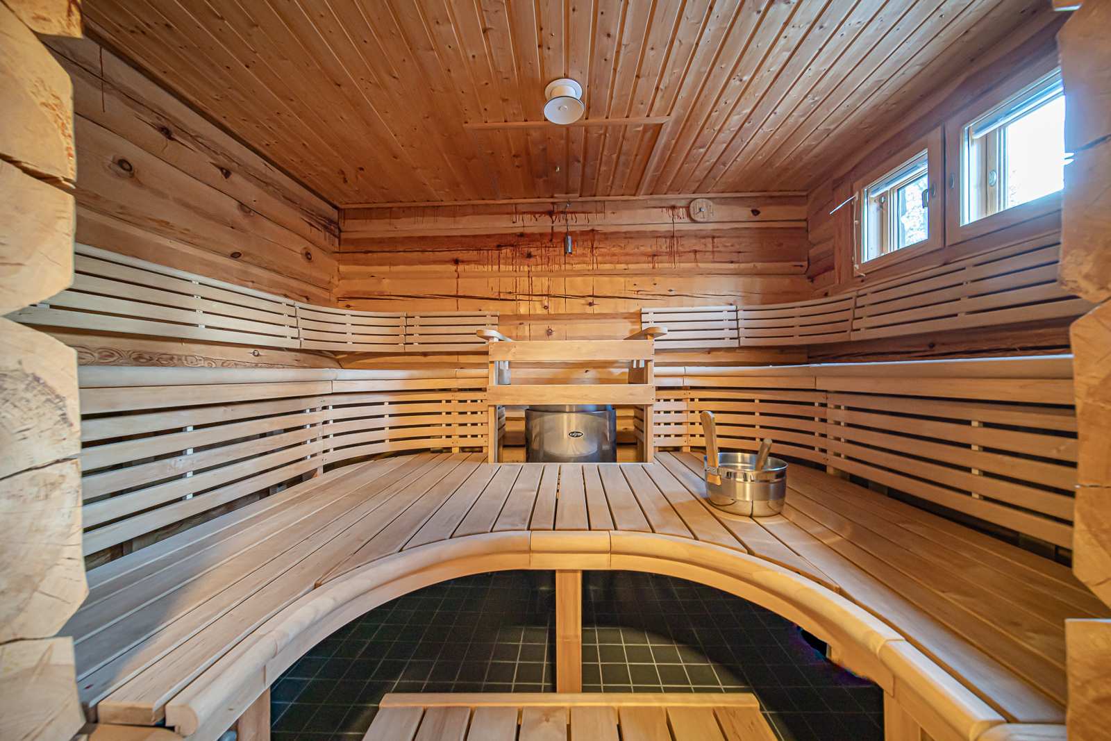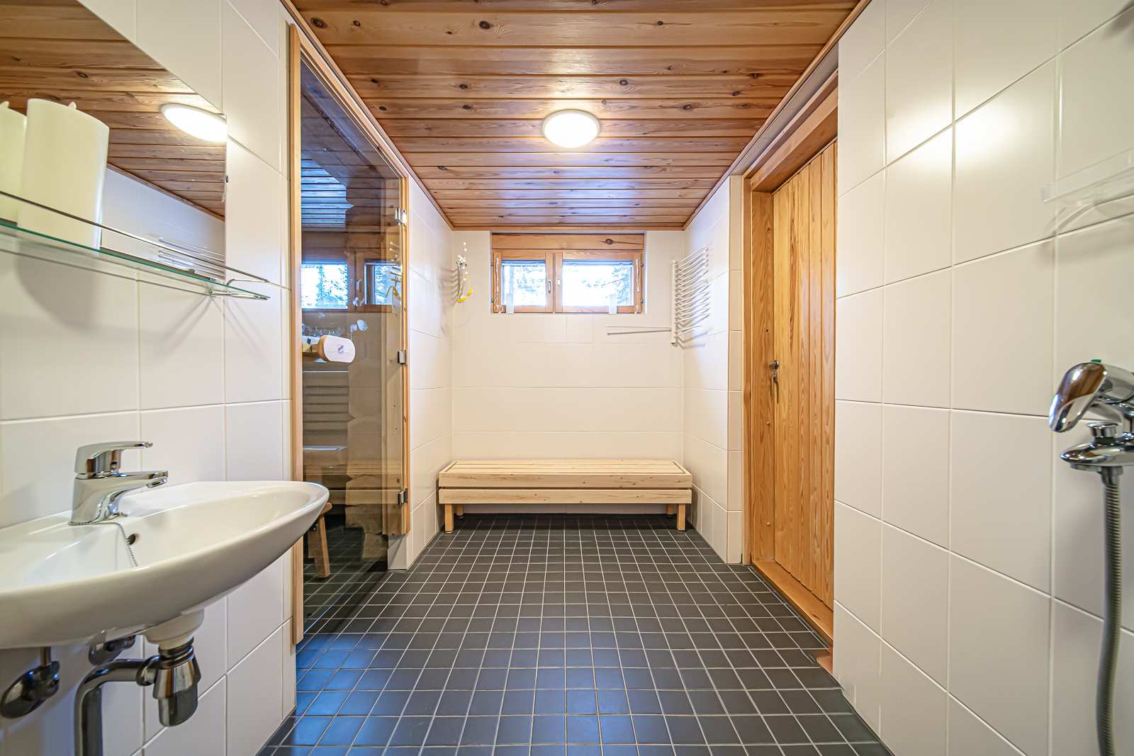 | Saunan pinnat | Seinät: puu Lattia: laatta |