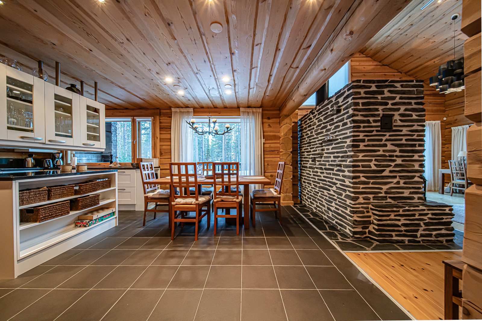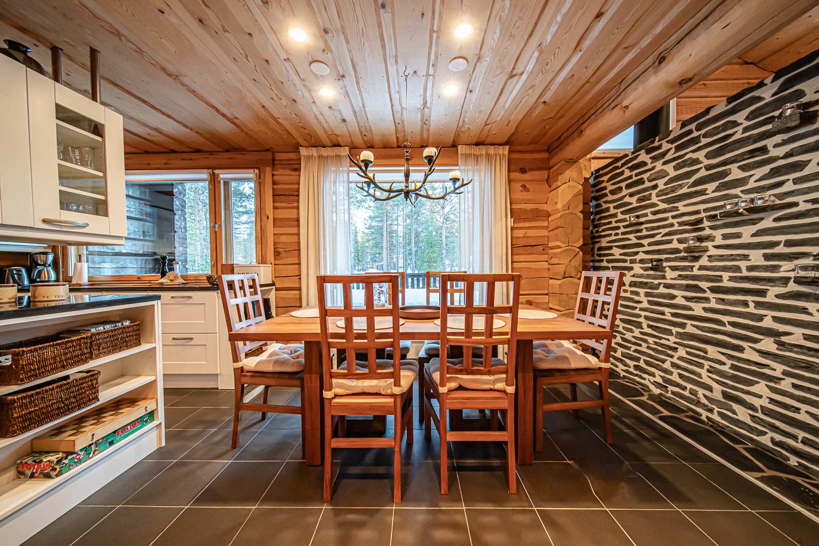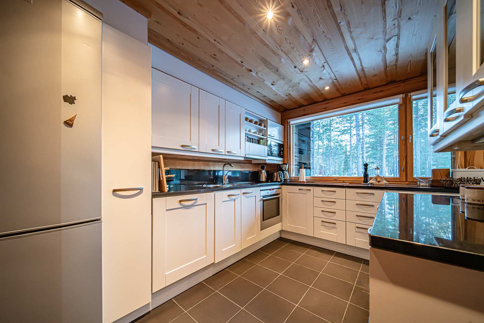 | Keittiön varustus | Jääkaappi ja pakastin: jääkaappi/pakastin Tasot: kivi Seinät: puu Lattia: laatta Muut varusteet: liesituuletin, mikroaaltouuni, astianpesukone Liesi/uuni: induktio, erillisuuni |