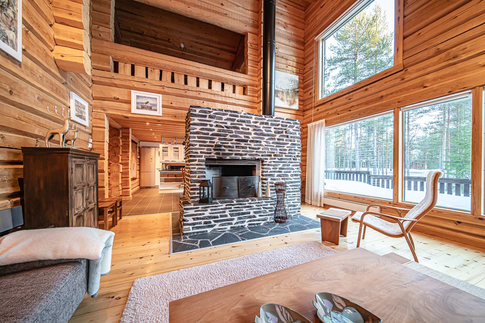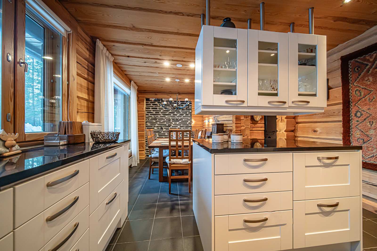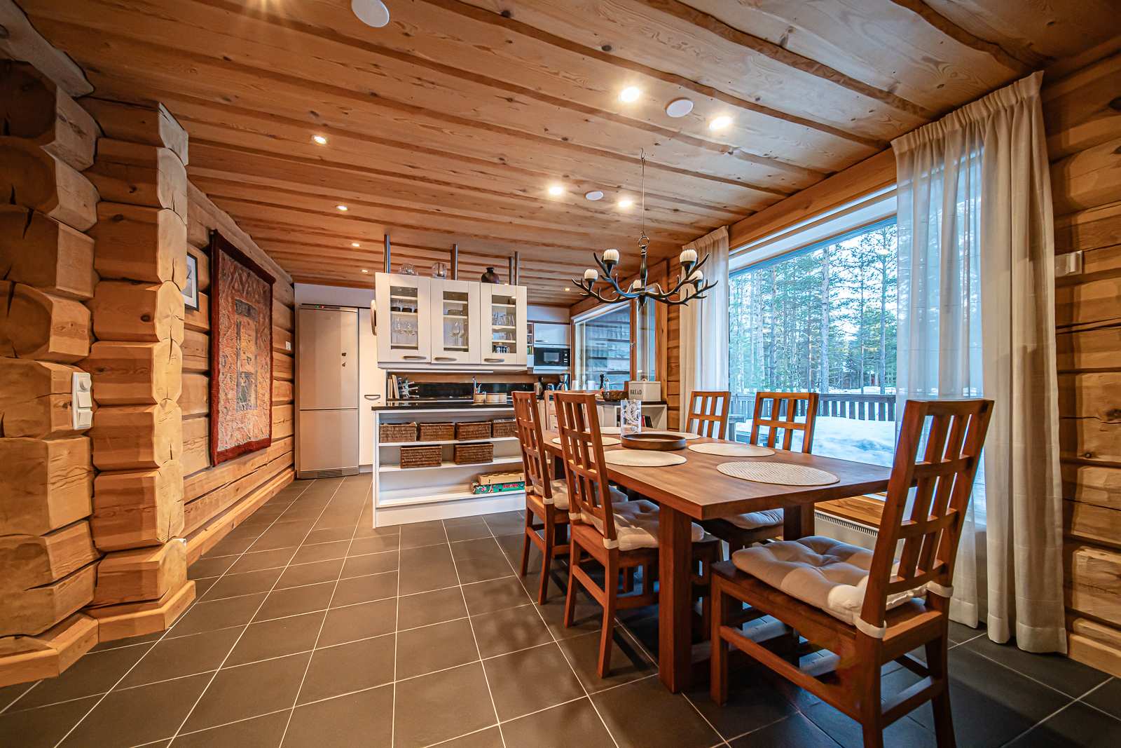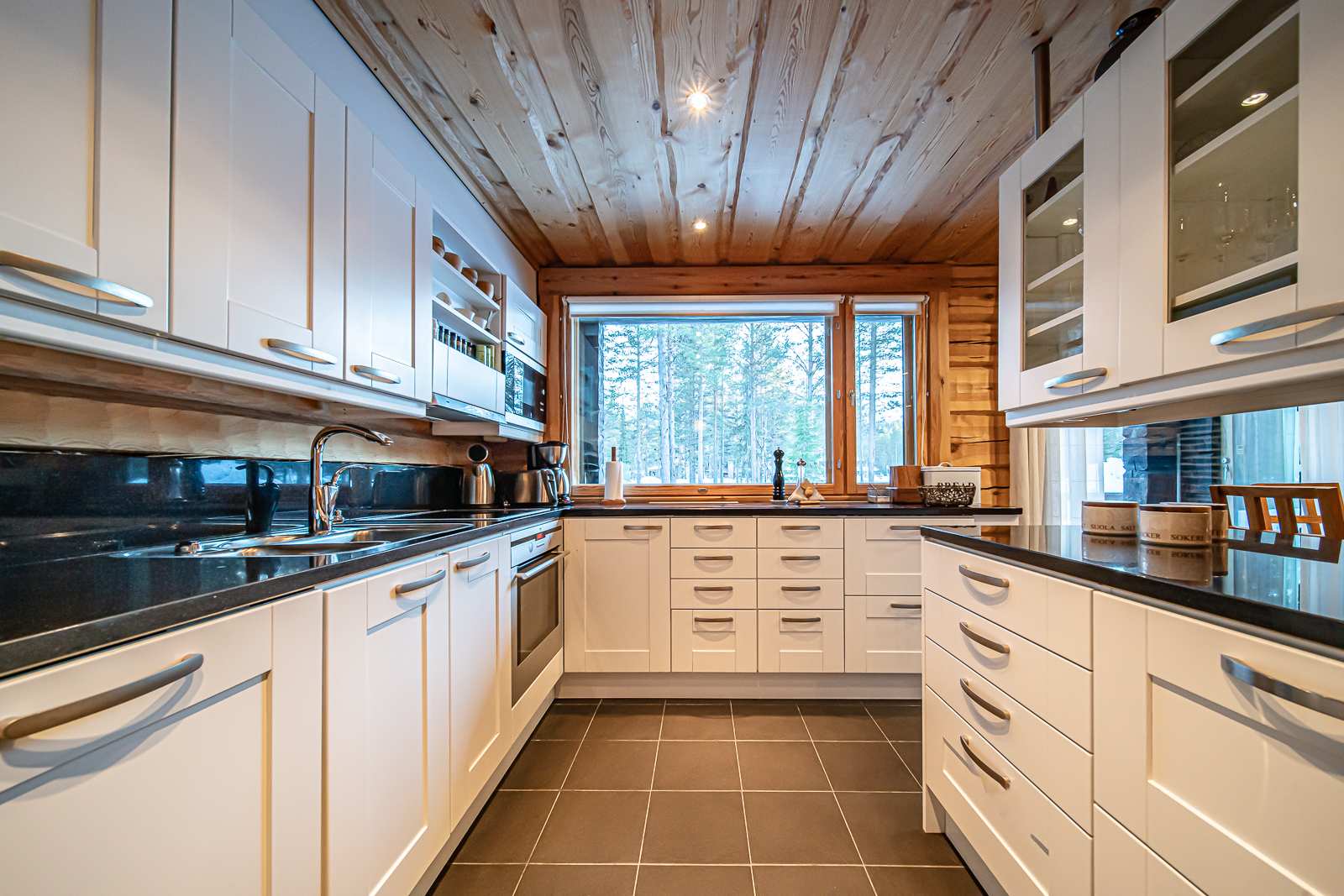 | Keittiön varustus | Jääkaappi ja pakastin: jääkaappi/pakastin Tasot: kivi Seinät: puu Lattia: laatta Muut varusteet: liesituuletin, mikroaaltouuni, astianpesukone Liesi/uuni: induktio, erillisuuni |