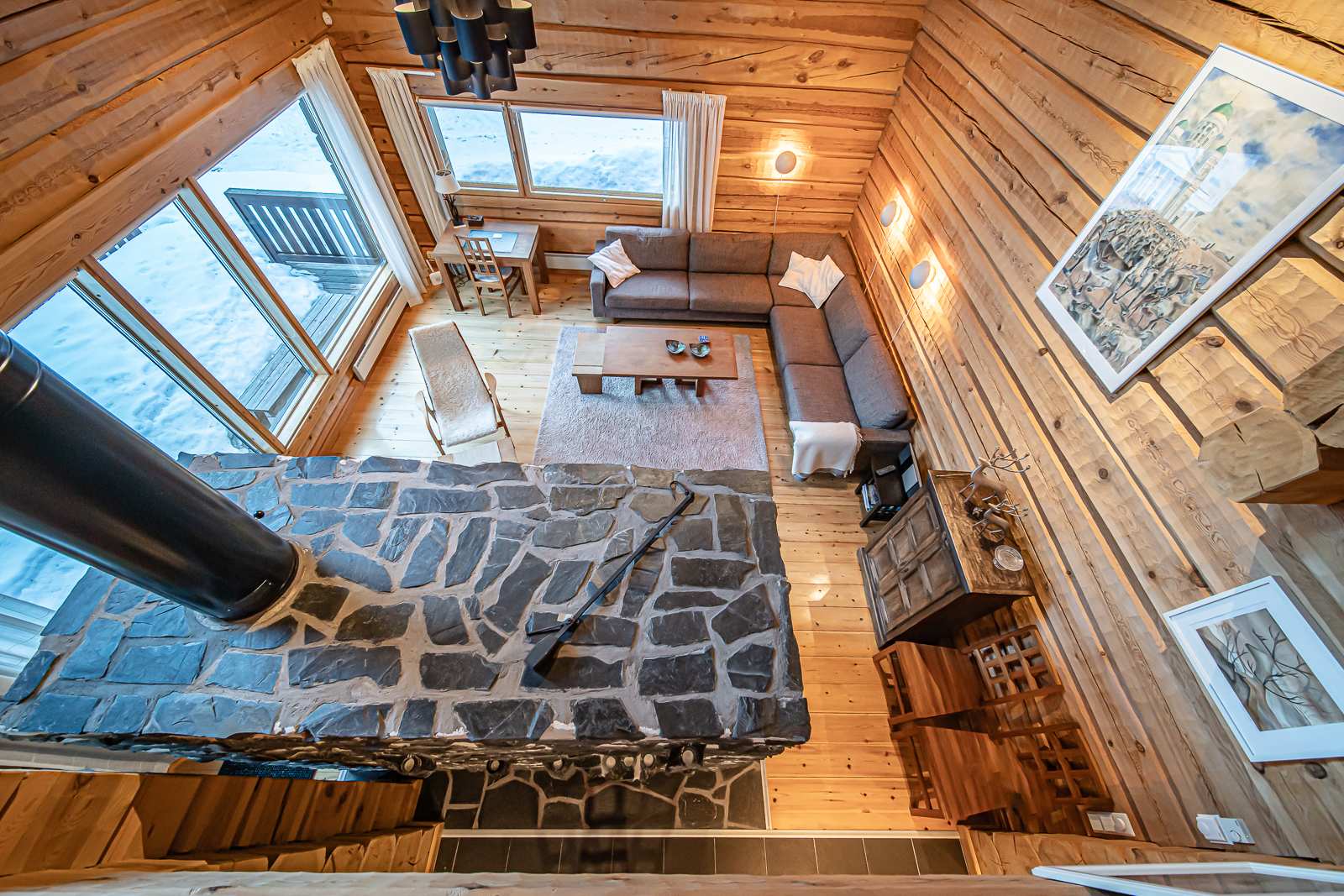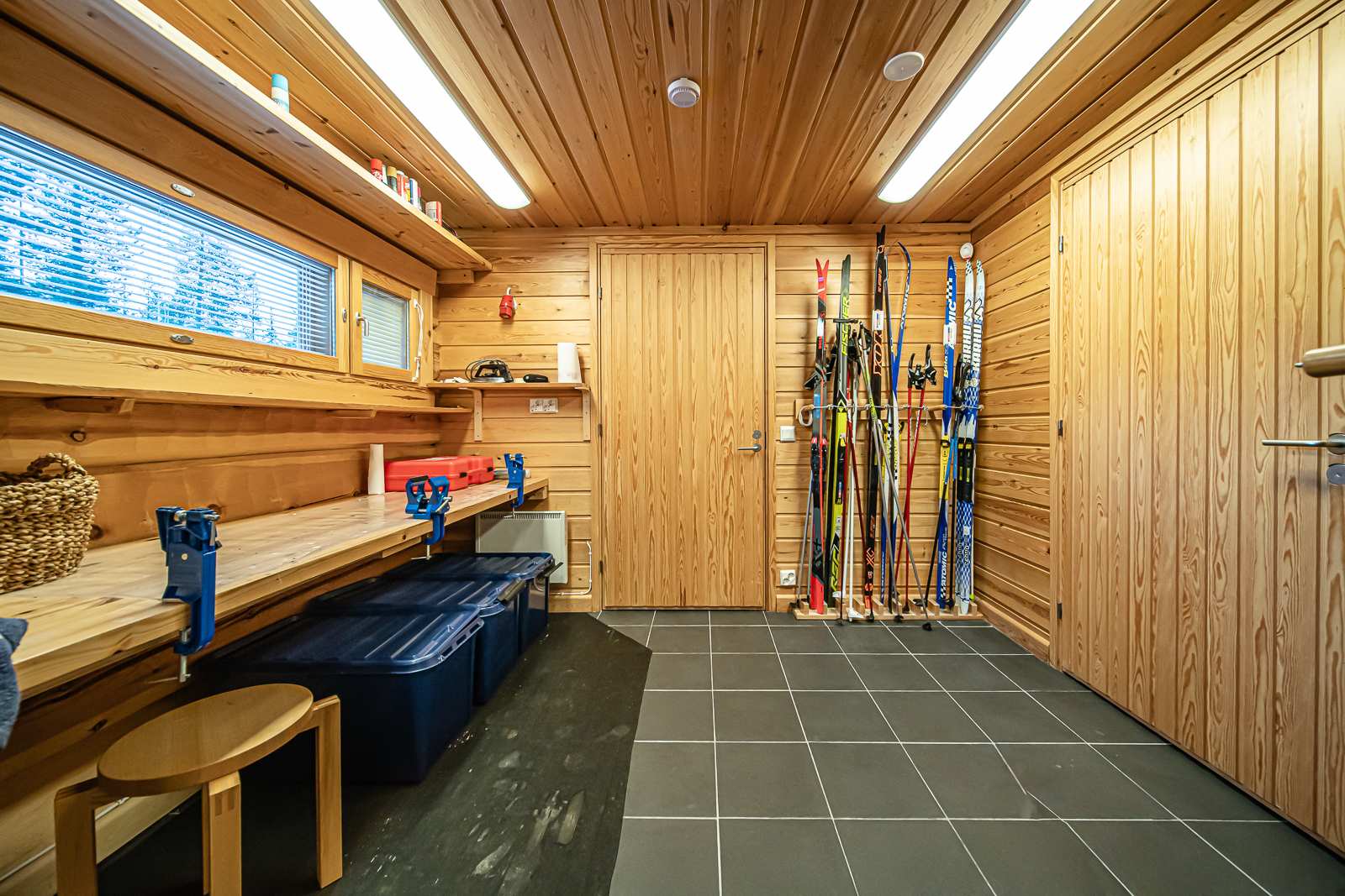 Alakerrassa eteinen, keittiö, ruokailutila, olohuone, yksi makuuhuone, pukuhuone/kodinhoitohuone, kylpyhuone, sauna ja erillinen wc. Alakerrassa myös suksienhuoltotila, kuivaushuone ja runsaasti säilytystilaa.