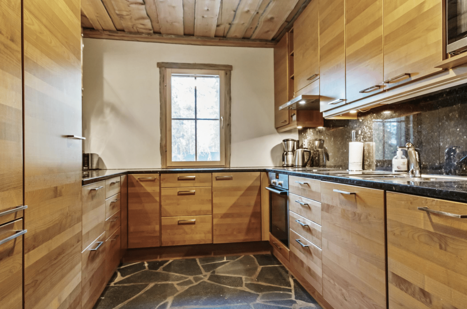 Isommassa A-puolen asunnossa 6 makuuhuonetta omalla kylpyhuone/suihku ja wc-tilalla. Lisäksi tilava eteinen, takkahuone-saunaosasto-pukuhuonetiloineen ja omalla takalla. Tilava ja tiloiltaan korkea olohuone-keittiötila takalla varustettuna. Kaikki mahtuvat kokoontumaan ruokapöydän ympärille. Alakerrassa harrastetilat, mm. suksien huoltotila, varastotiloja, tekninen tila. Tilava koko huoneiston kiertävä terassi, ulkona myös takka.