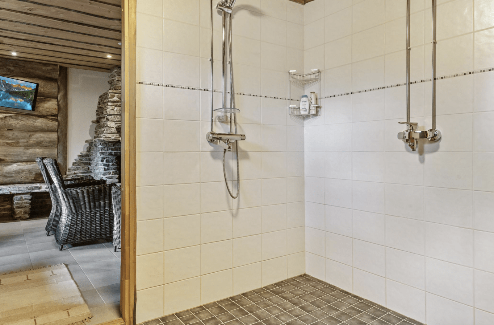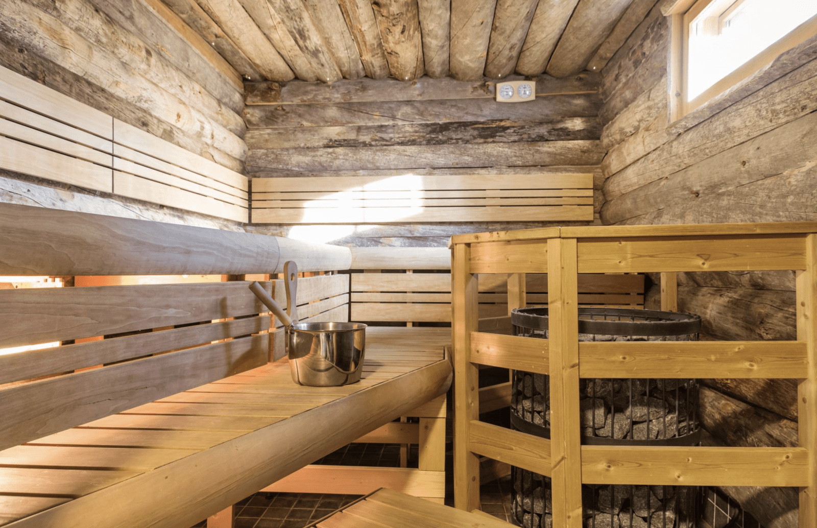 | Saunan pinnat | Seinät: puu Lattia: laatta |